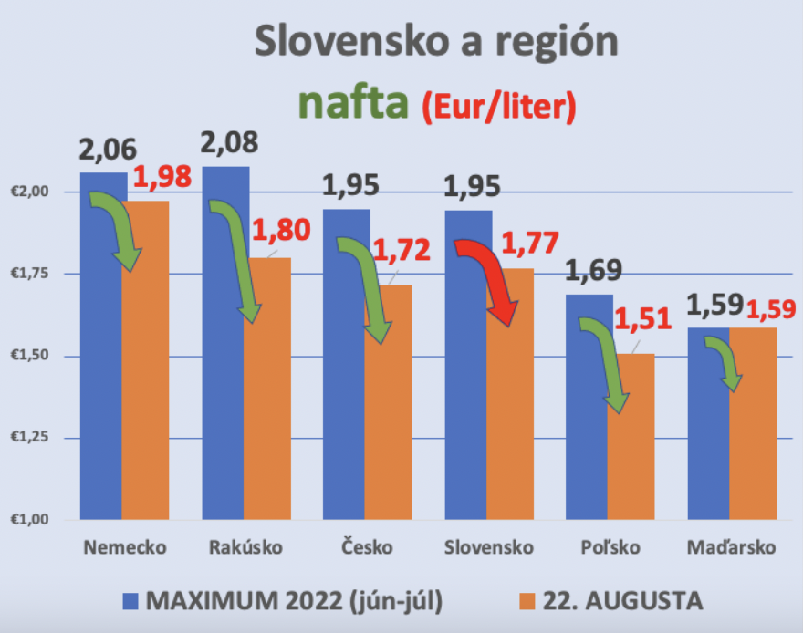 v Čechách idú ceny oboch druhov palív dole a sú u benzínu o 10 a u nafty o 5 centov nižšie. U benzínu je to nižšou spotrebnou daňou. Tými sa na Slovensku počas energetickej a inflačnej krízy nepohlo. Štát má „nadpríjmy“ z vysokých cien a veľmi sa teší.