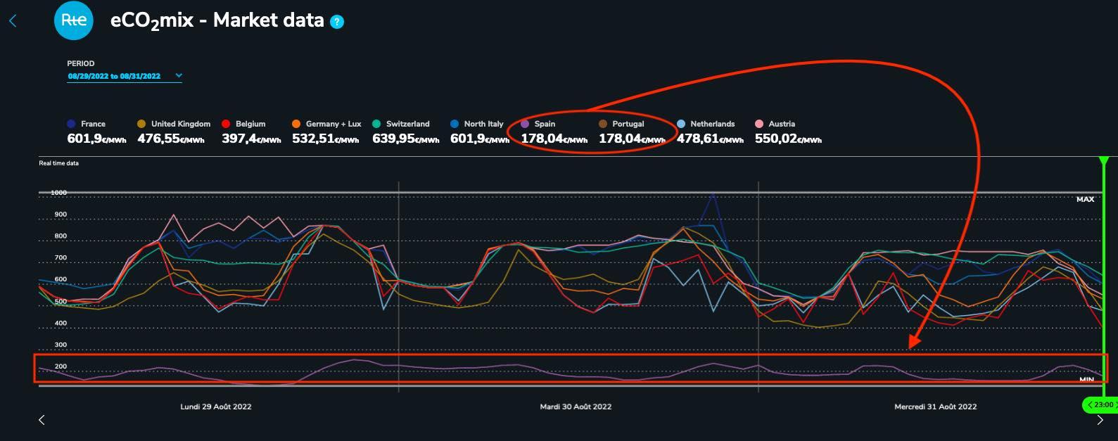 Tam, kde je dostatok plynu (Španielsko a Portugalsko) z Afriky, kde je aj jadra rozumne a kde aj vetrík fúka a slniečko svieti, je cena energie okolo 200-250 eur za MWh max. Viď graf.