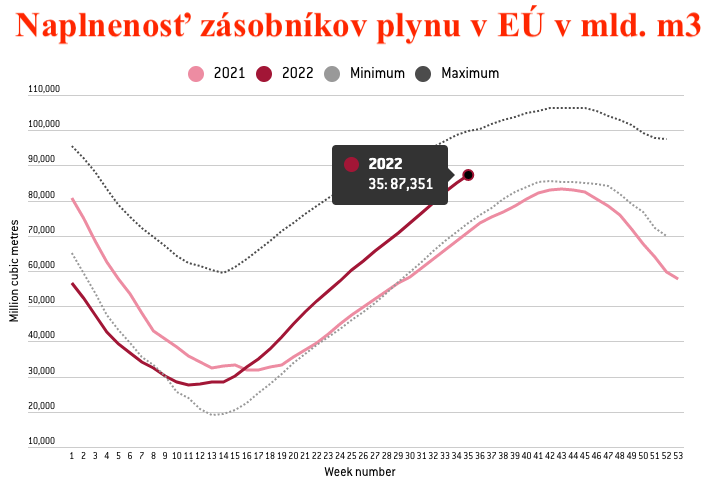 3. V zásobníkoch v EÚ (a to počúvame 6 mesiacov o sústavných problémoch s plynom z Ruska) je už dnes takmer 90 miliárd m³. Veľmi pravdepodobne sa vďaka teplému počasiu dostane EÚ blízko 100 miliárd m³ do 4-5 týždňov a možno sa v októbri naplnia aj na maximum 106 miliárd m³