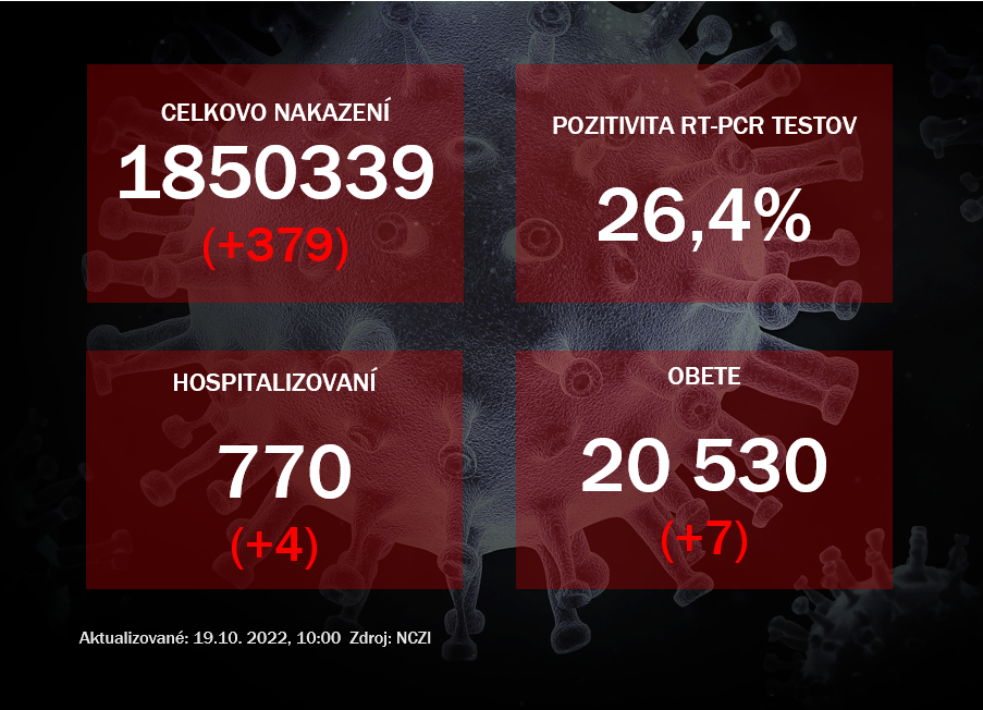 Za uplynulý deň pribudlo sedem úmrtí na covid-19. Od začiatku pandémie si nový koronavírus vyžiadal už 20 530 obetí. V nemocniciach je hospitalizovaných 770 pacientov s ochorením covid-19.
