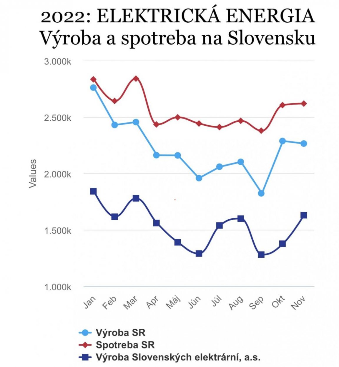 Výroba elektriny na Slovensku dosiahla predbežne v roku 2022 spolu 27 TWh. Nakoľko spotreba Slovenska bola predbežne 30,5 TWh.