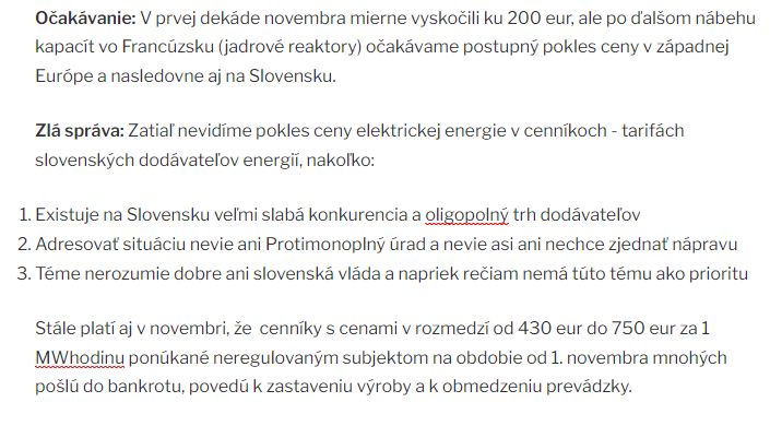 4) Zaujímavé, že keď cena elektriny v druhom polroku 2022 na trhovch vyskočila hore, dodávatelia okamžite a aj 3-krát do mesiaca (september) tarify menili, lebo dopredu lacnejšiu elektrinu nakúpenú nemali.