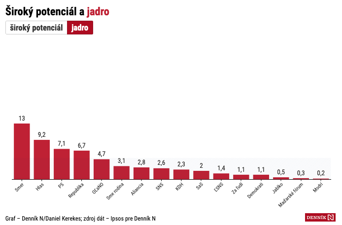 2) Jadro, to znamená „napevno rozhodnutí ich voliť“, má hodnotu 10 %, u niektorých strán takmer nič (2 ľudia z 1000), u niektorých prekvapivo veľa (22 ľudí z 1000). Jadro môžeme asi rovno odpísať ako voličov, ktorých hlasy budú stratené, lebo svoj názor zmeniť nechcú a nehodlajú.