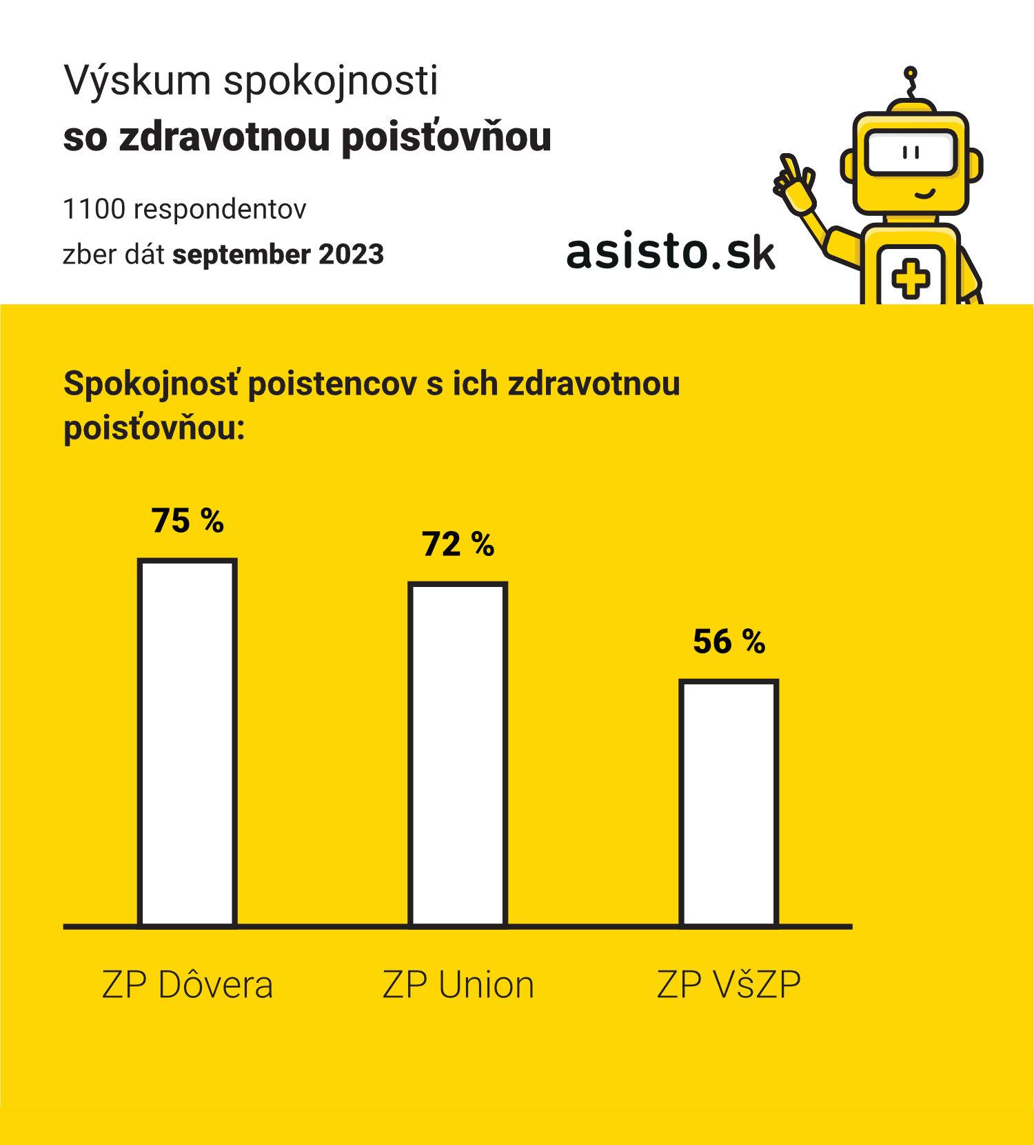 so svojou zdravotnou poisťovňou je spokojných 68% respondentov. Najviac spokojných poistencov má Dôvera (75%), nasleduje Union (72%) a najmenej spokojných poistencov má VšZP (56%). Spokojnosť s poisťovňou sleduje Asisto.sk už štvrtý rok po sebe a ukazuje sa, že počet spokojných poistencov dlhodobo stúpa. V roku 2020 ich bolo 58%, dnes už 68%.