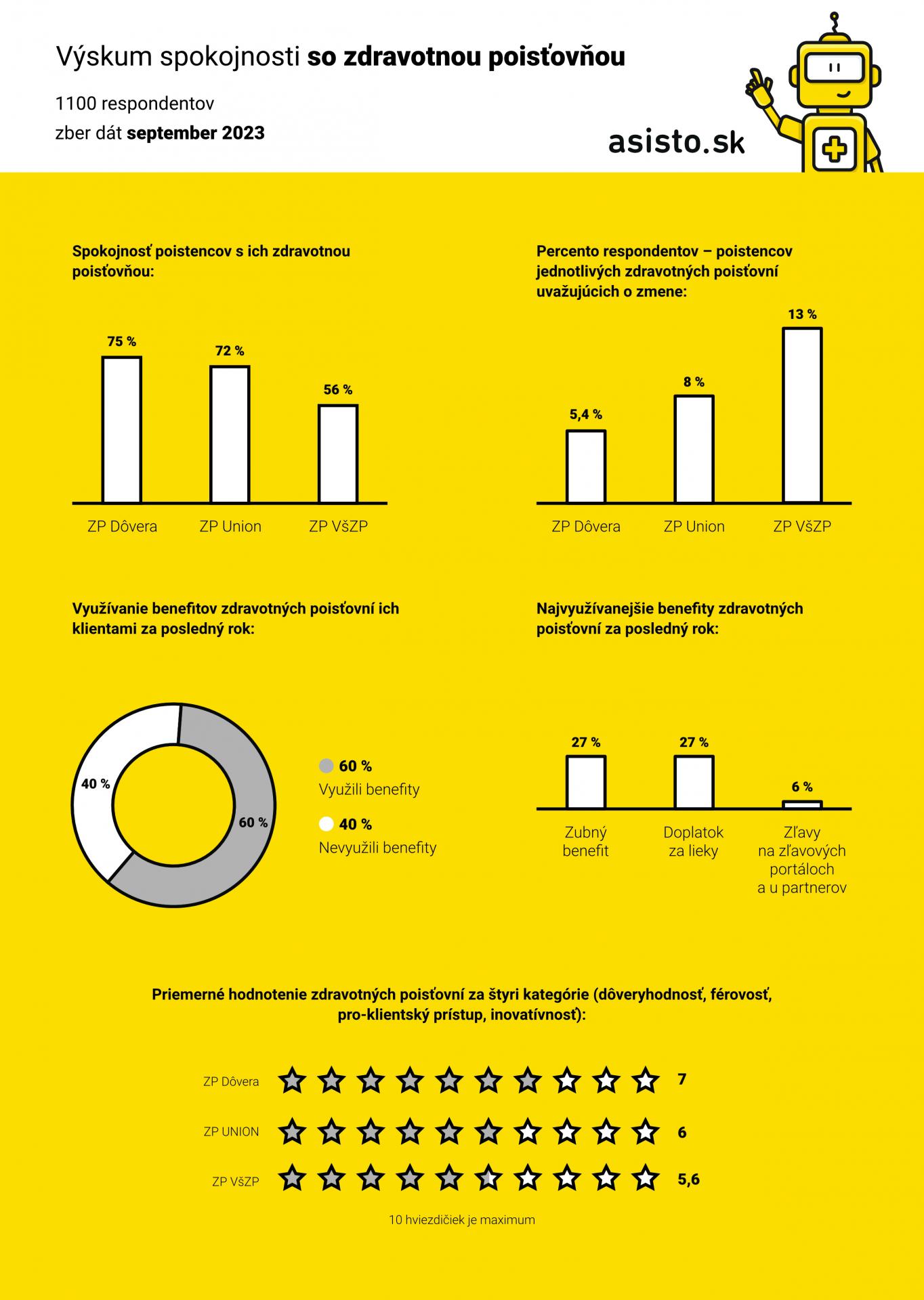 Vo výskume sa Asisto.sk zameralo aj na to, ako verejnosť vníma zdravotné poisťovne z pohľadu ich dôveryhodnosti, férovosti, pro-klientského prístupu a inovatívnosti. Respondenti udeľovali v každej z týchto štyroch kategórii všetkým trom poisťovniam hviezdičky. Od 1 hviezdičky po 10, keď 10 predstavuje najlepšie hodnotenie. Poradie poisťovní vo všetkých štyroch kategóriách bolo rovnaké: 1. Dôvera, 2. Union, 3. VšZP. Dôvera v priemere získala 7 hviezdičiek, Union 6 a VšZP 5,6 hviezdičky.
