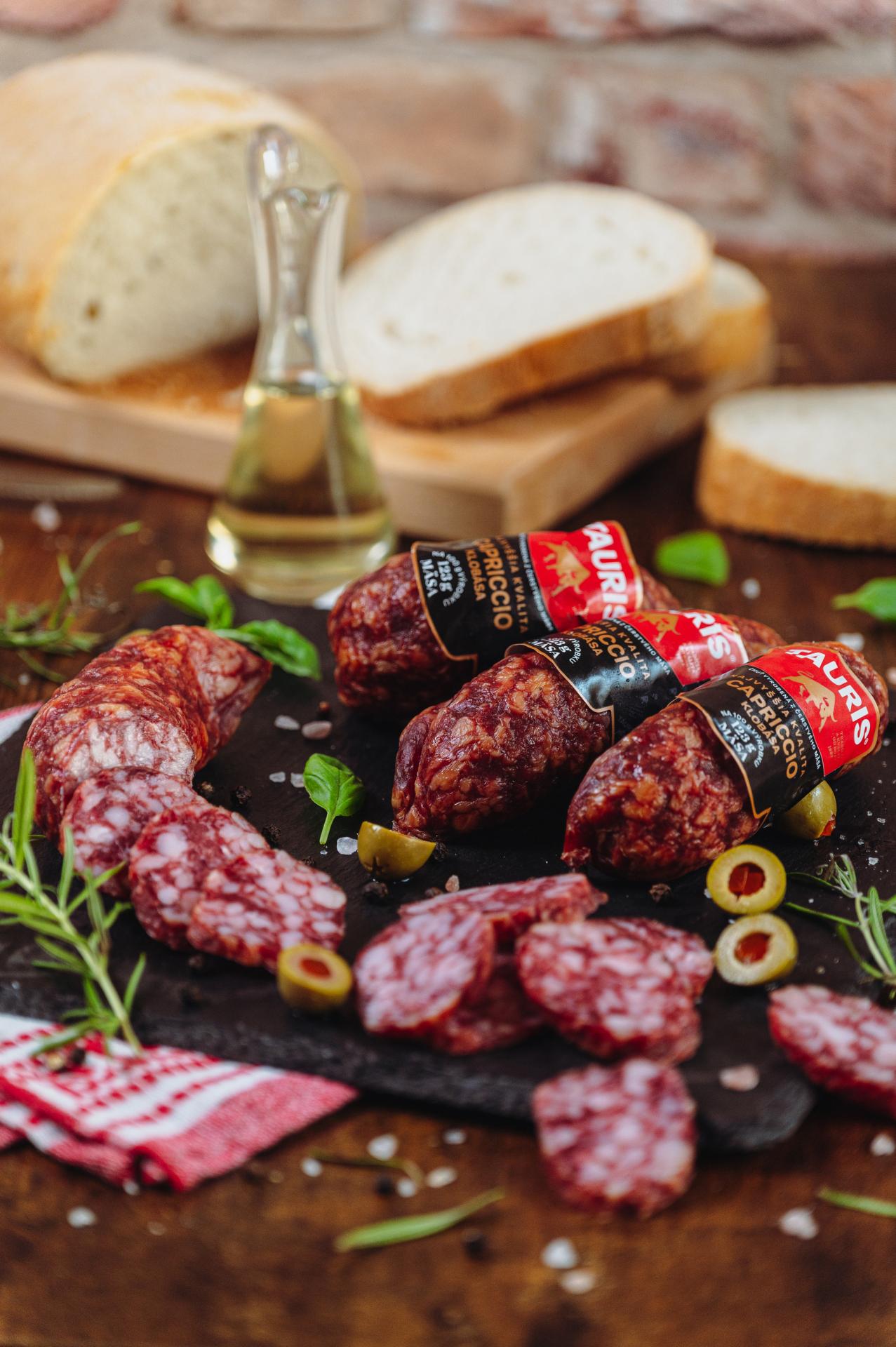 Na jeseň tohto roku prichádza TAURIS okrem rebenrandingu obalov aj vizuálne aj chuťovo atraktívnu novinku s príznačným názvom Capriccio klobásy. „Capriccio“ totiž v preklade znamená rozmar spojený s pôžitkom z jedla. Na výrobu tejto klobásy, ktorá je už v predaji, sa používa chudé bravčové mäso rozrobené vo vlastnej rozrábke. Doplnená je tvrdou chrbtovou slaninou, ktorá vytvára typickú mozaiku tohto výrobku. Sladko-korenistú chuť jej dodávajú aníz a ligurček a biele a čierne korenie dotvára celkový chuťový profil. Okrem verzie bez úpravy je k dispozícií aj klobása s efektnou imitáciou ušľachtilej plesne pod názvom Capriccio klobása bianco.
