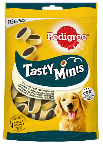 Váš domáci miláčik si zamiluje tieto lahodné maškrty Pedigree Tasty Minis. Sú dostupné v rôznych tvaroch a príchutiach a obsahujú dôležité omega-3 nenasýtené mastné kyseliny, vitamíny a minerály. Neobsahujú umelé farbivá alebo príchute a obsahujú menej ako 5 % tuku. Praktický, opätovne uzatvárateľný obal zachováva kvalitu a čerstvosť. Je vhodným doplnkom na spoločné chvíle vonku a slúži ako ideálna odmena za dobre splnenú úlohu. Pedigree Tasty Minis sú dostupné v príchutiach Beef & Cheese, Beef & Chicken a Chicken & Duck.