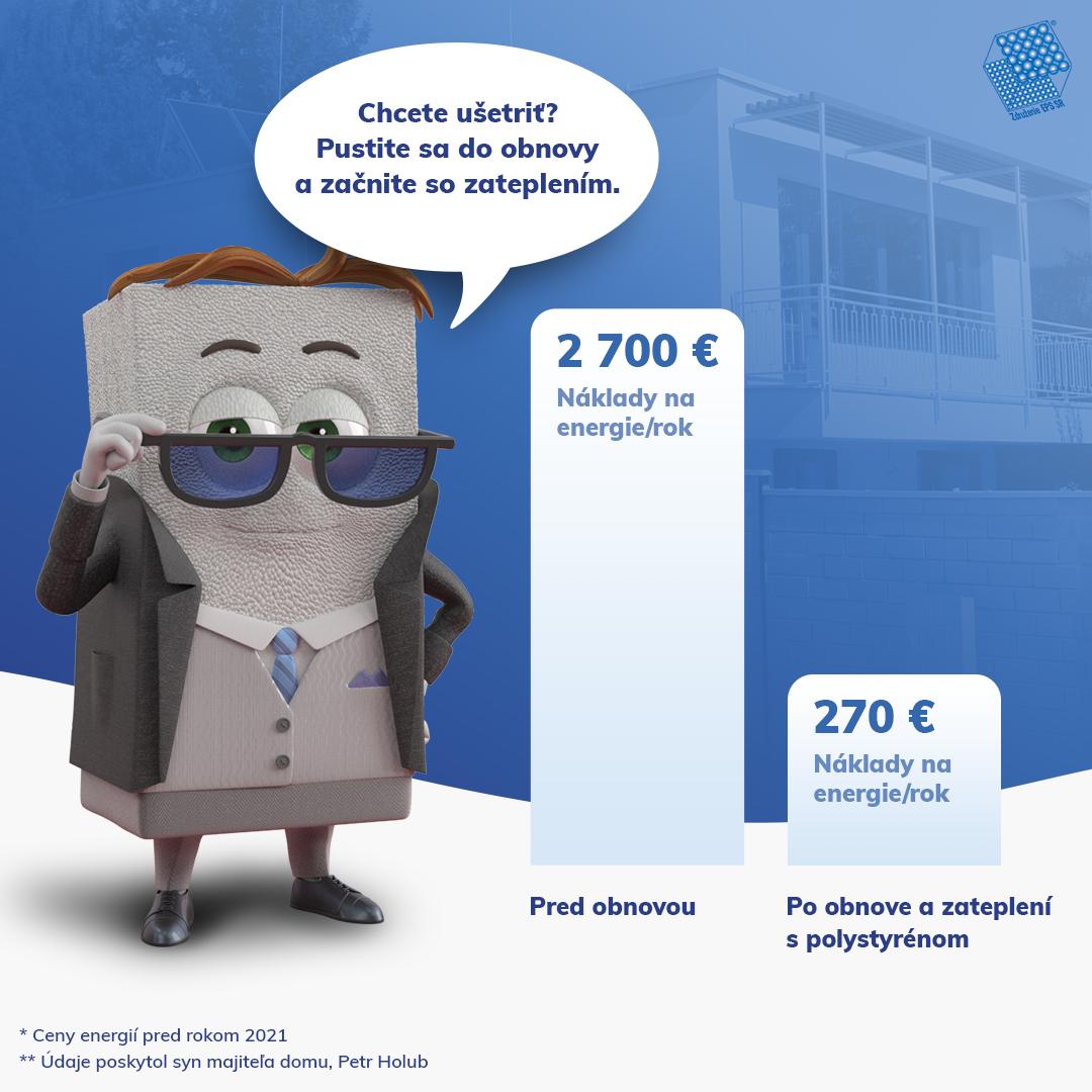 Rodina Holubovcov platila pred obnovou takmer 2 700 eur ročne na prevádzku domu s úžitkovou plochou 130 m2. Po obnove klesli náklady na približne 270 eur ročne. Tieto ceny sa držali až do roku 2021. „Ak by nedošlo k obnove, momentálne by náklady narástli na asi 7 700 eur. My ale predpokladáme, že celkové ročné náklady sa s novými cenami energií zvýšia ‚len‘ na 850 eur, čo je ešte pomerne prijateľné,“ vysvetľuje Petr Holub.