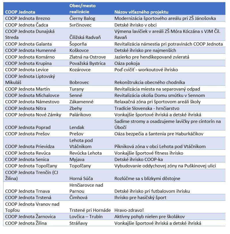 To všetko a mnohé ďalšie oblasti finančne podporí Nadácia COOP Jednota cez Program podpory lokálnych komunít. V aktuálnom ročníku o grant požiadali obce, základné školy, mestské alebo obecné kultúrne strediská, športové kluby, materské školy i občianske združenia. Na základe hlasovania verejnosti napr. v obci Bobrovec bude v obci realizovaná rekonštrukca obecného chodníka. Z výmeny lavičiek v areáli základnej školy sa budú tešiť deti ZŠ Móra Kóczána s VJM Čiližská Ravaň. Nadácia podporí tiež modernizáciu športového areálu pri ZŠ Jánošovka v Čiernom Balogu, nové detské ihrisko pribudne v obci Svrčinovec a z nového detského ihriska pre najmenších sa budú tešiť v obci Koškovce. V Palárikove a v Stráňavách vystavajú nové vonkajšie športové a detské ihriská. Na Myjave bude systém COOP Jednota reprezentovať detské ihrisko s príznačným názvom - Detské ihrisko COOP-ka. Dôležitosť pohybu a športu v živote detí, mládeže i dospelých je zrejmá z množstva víťazných projektov, ktoré sú zamerané práve na aktívne trávenie času na ihriskách a športoviskách. Vonkajšie športové fitness ihrisko pribudne v Revúckej Lehote, v Čimhovej si prídu na svoje hasiči i nádejní hasiči, ktorí budú môcť využívať na tréning ihrisko pre hasičský šport. Špeciálne workoutové ihrisko bude vybudované v Kozárovciach. Typickú slovenskú tradíciu hrnčiarstvo môžu vďaka Nadácie COOP Jednota rozvíjať v Zbehoch. Oáza pokoja zvíťazila v Považskej Bystrici. Relaxovať budú aj v Zákamennom, v relaxačnej zóne pri športovom areáli školy a v Topoľčanoch v oddychovej zóne na Puškinovej ulici. Príjemné piknikovanie si budú môcť užit v Lehote pod Vtáčnikom, kde obyvateľom obce sprístupnia piknikovú zónu. Oáza bezpečia a šantenia pre Haburkáčikov bude tešiť všetky deti v Prešove. Nadácia COOP Jednota prispeje v tomto ročníku pojektu na mnohé ďalšie ušľachtilé a prospešné projekty, ktoré zveľadia okolie, prostredie pre komunitný život, stretávanie a spoločné chvíle. Víťazi sú známi, tohtoročný program na získanie grantu Nadácie COOP Jednota je ukončený.