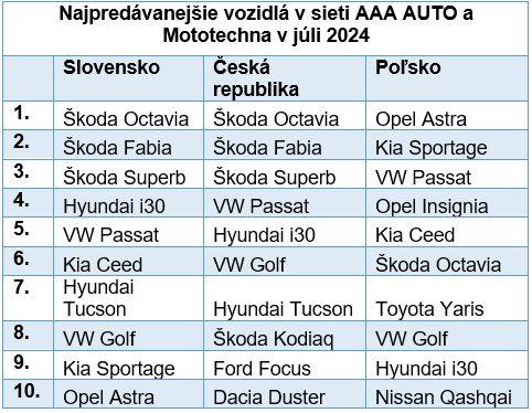 Pokiaľ ide o najpredávanejšie vozidlá, na Slovensku aj v júli naďalej vedie značka Škoda, nasledovaná Volkswagenom, Kiou a Hyundaiom. Z modelov sú najpopulárnejšie Škoda Octavia, Škoda Fabia a Škoda Superb. Medzi karosériami je najobľúbenejšie kombi, ktoré tak predbehlo dlhodobo vedúci hatchback. Pokiaľ ide o palivá, prvenstvo patrí benzínovým vozidlám (47 %), pričom elektromobily stále tvoria len 1,3 % z celkových predajov. Najviac vozidiel sa v rámci Slovenskej republiky predáva v Bratislave, nasledujú pobočky Nitra, Košice, Žilina a Trnava.