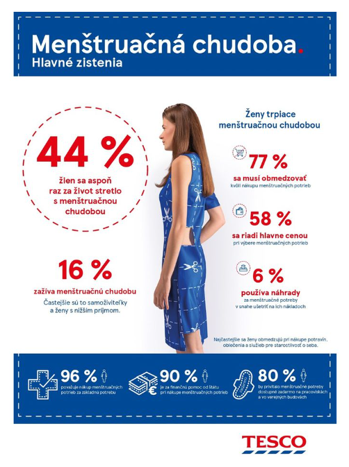 Tesco na problém menštruačnej chudoby na Slovensku upozornilo v máji tohto roka v kampani „Odstrihli by ste si kus oblečenia?“. Reťazec v spolupráci s agentúrou NMS zrealizoval exkluzívny online prieskum Menštruačná chudoba na Slovensku*. Z dát vyplýva, že 16 percent opýtaných ju zažíva aj v súčasnosti, pričom pre dve percentá je to pravidelný problém. Častejšie sú to samoživiteľky a ženy s nižším príjmom. Šesť percent opýtaných dokonca priznalo, že používa náhrady za menštruačné potreby ako toaletný papier, noviny, staré handry, špongie, ale aj iné. Symbolom edukačnej kampane Tesca o menštruačnej chudobe sú aj preto rozstrihané šaty od módnej návrhárky Claudie Kolesárovej.