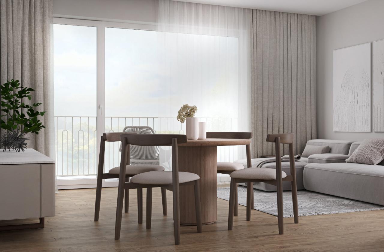 Interiéry bytov sú ladené do moderného štýlu, kde dominujú kvalitné materiály – od kúpeľňovej sanity až po odolné laminátové podlahy, ktoré spĺňajú požiadavky na praktickosť aj estetiku.