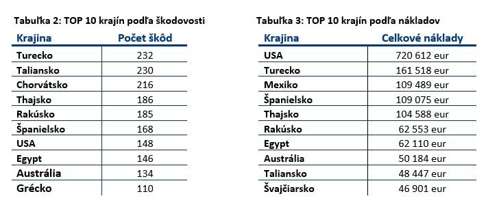 Takmer tretinu všetkých škôd z cestovného poistenia nahlásili klienti Allianzu v júli a v auguste. V počte poistných udalostí v roku 2024 viedlo Turecko s 232 škodami, ktoré vystriedalo Chorvátsko, ktoré bolo najškodovejšie v roku 2023 a minulý rok skončilo tretie s 216 škodami. Druhou najškodovejšou destináciou bolo Taliansko, kde Allianz riešil 230 škôd. V škodovosti nasledovali Thajsko, Rakúsko, Španielsko, USA, Egypt, Austrália a Grécko. Najnákladnejšou dovolenkovou destináciou v roku 2024, rovnako ako rok predtým, bolo USA, kde Allianz za vzniknuté poistné udalosti vyplatil vyše 720-tisíc eur, čo je takmer tretina nákladov za všetky škody v cestovnom poistení. S výrazným odstupom bolo druhou najdrahšou krajinou v cestovnom poistení Turecko s nákladmi za vyše 161-tisíc eur. Nasledovalo Mexiko a Španielsko zhodne s nákladmi za viac ako 109-tisíc eur, ďalej Thajsko, Rakúsko, Egypt, Austrália, Taliansko a Švajčiarsko.