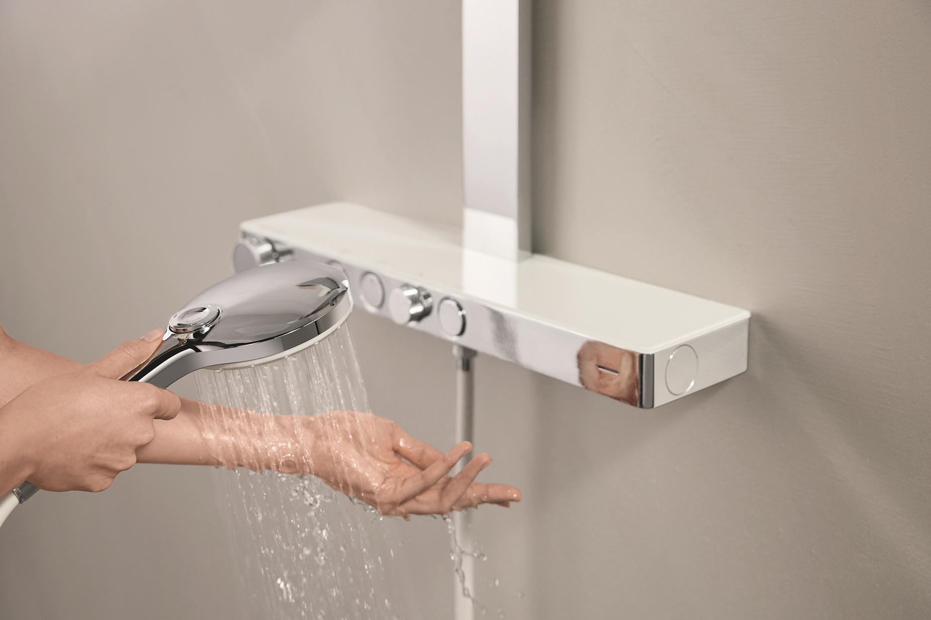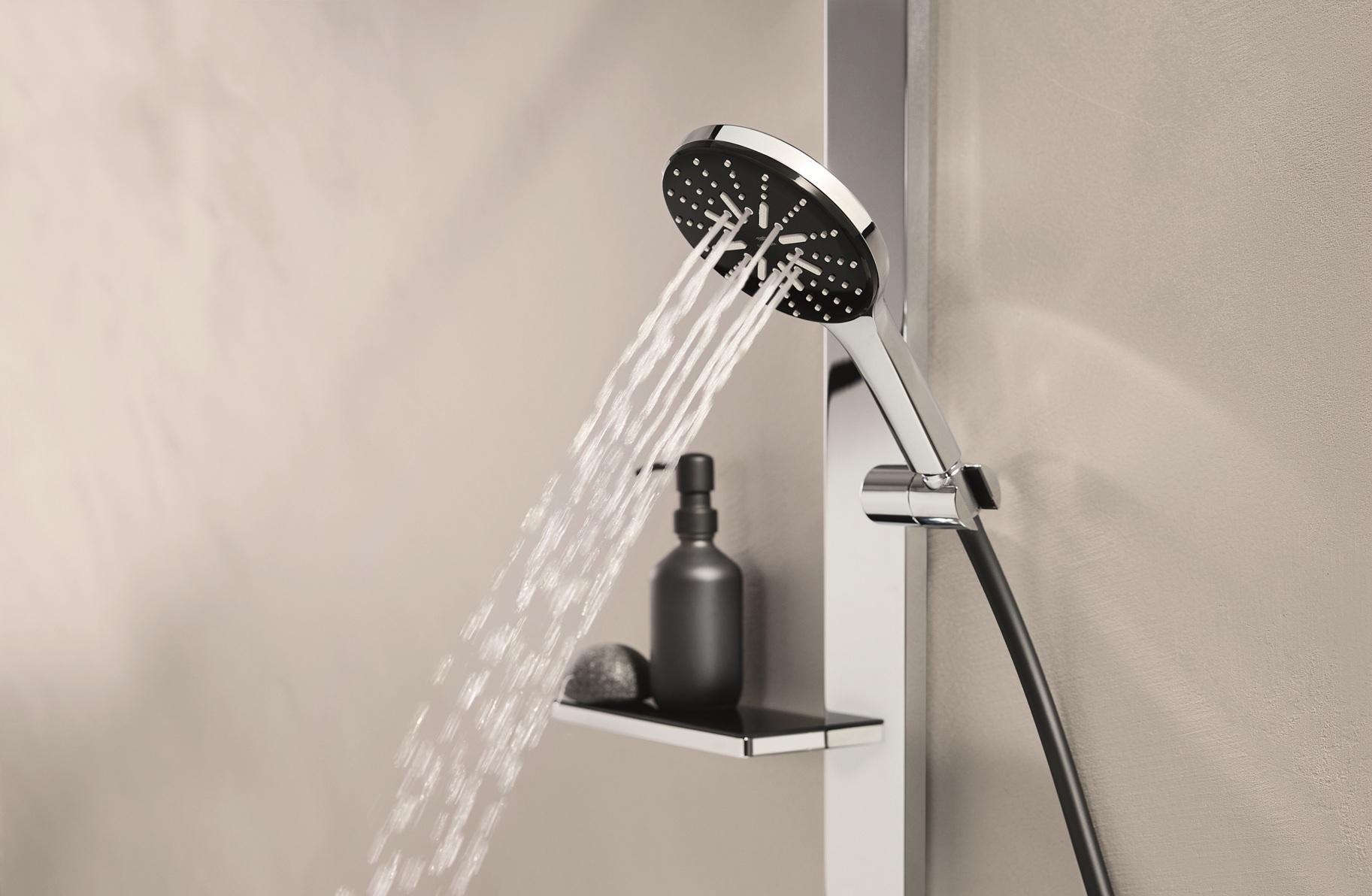 Sprcha GROHE Rainshower Aqua Pure, ktorá povyšuje kúpeľňu na vaše privátne wellness, ešte viac umocňuje zážitok vďaka širokej hlavovej sprche. Je k dispozícii v okrúhlom tvare s priemerom 360 mm alebo v obdĺžnikovom tvare s rozmermi 400 × 230 mm a úplne vás obklopí vodou. Ponúka možnosť výberu z dvoch rôznych režimov prúdu: Rain, pripomínajúci upokojujúci letný dážď, alebo ActiveRain, určený na oplachovanie šampónu aj osviežujúcu masáž. Ručná sprcha umožňuje individualizáciu zážitku vďaka trom rôznym režimom prúdu: Rain, masážny Active Massage a Rain+, ktorý kombinuje vzduch a vodu pre čistú relaxáciu tela aj duše. Rôzne režimy prúdu a hlavové a ručné sprchy je možné ľahko ovládať pomocou termostatu SmartControl, ktorý umožňuje plynulé nastavenie teploty a prietoku. Umožňuje zvýšiť objem z úsporného na plný alebo ho znížiť jednoduchým otočením tlačidla a dokonca umožňuje uložiť osobné nastavenie pre budúce potešenie.
