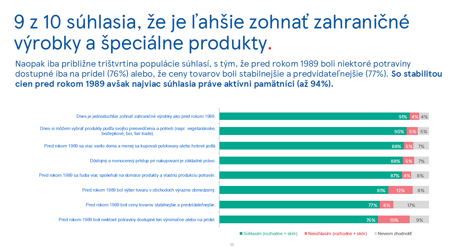Aj podľa väčšiny Slovákov a Sloveniek sme po roku 1989 jednoznačne získali väčšiu slobodu výberu. Potvrdzuje to online prieskum, ktorý si Tesco nechalo vypracovať pri príležitosti Dňa boja za slobodu a demokraciu agentúrou NMS na reprezentatívnej vzorke Slovenska 1 002 respondentov. Väčšina Slovákov a Sloveniek si myslí, že po roku 1989 sa nakupovanie zlepšilo. Najviac oceňujú široký výber tovaru, nakupovanie v zľavách aj možnosť nakupovať online. Až 9 z 10 opýtaných súhlasí, že si dnes môžu vybrať produkty podľa svojho presvedčenia a potrieb, či už ide o vegetariánske, bezlepkové alebo bio, a zároveň je ľahšie zohnať zahraničné výrobky. Podľa 81 % bol výber tovaru v obchodoch pred rokom 1989 výrazne obmedzený, ľudia sa však viac spoliehali na domáce výrobky a vlastnú produkciu potravín. Takmer polovica za najväčší problém nakupovania za bývalého režimu označila fronty na čakanie a prázdne regály.