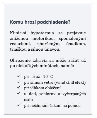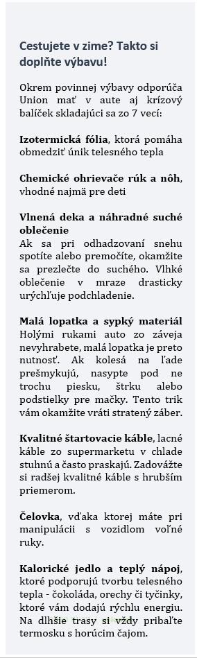 Rozumné balenie vozidla a kontrola výbavy sú v chladných mesiacoch rovnako dôležité ako samotná jazda. „V lete často vodič a posádka čakajú na pomoc relatívne komfortne. V mínusových teplotách však môže už po niekoľkých minútach státia za zvodidlami dôjsť k výraznému ochladzovaniu organizmu, zhoršeniu koncentrácie, trasu a v kombinácii so stresom z nehody výrazne stúpa riziko ďalších nehôd a zdravotných komplikácií,“ upozorňuje lekárka z Union zdravotnej poisťovne, Ingrid Dúbravová.