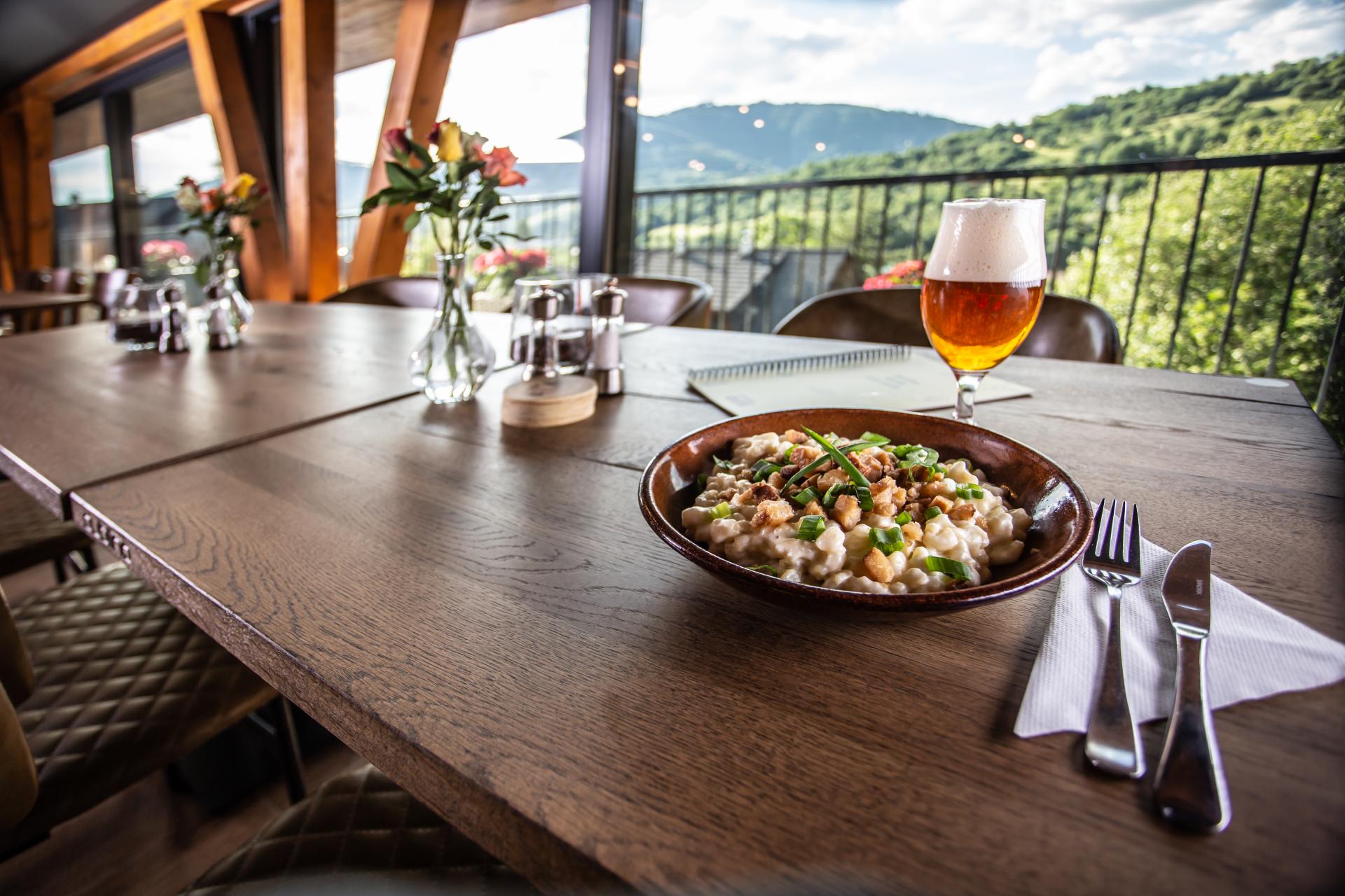 Reštaurácia s krytou terasou a vlastný Pivovar Vŕšky priamo v resorte