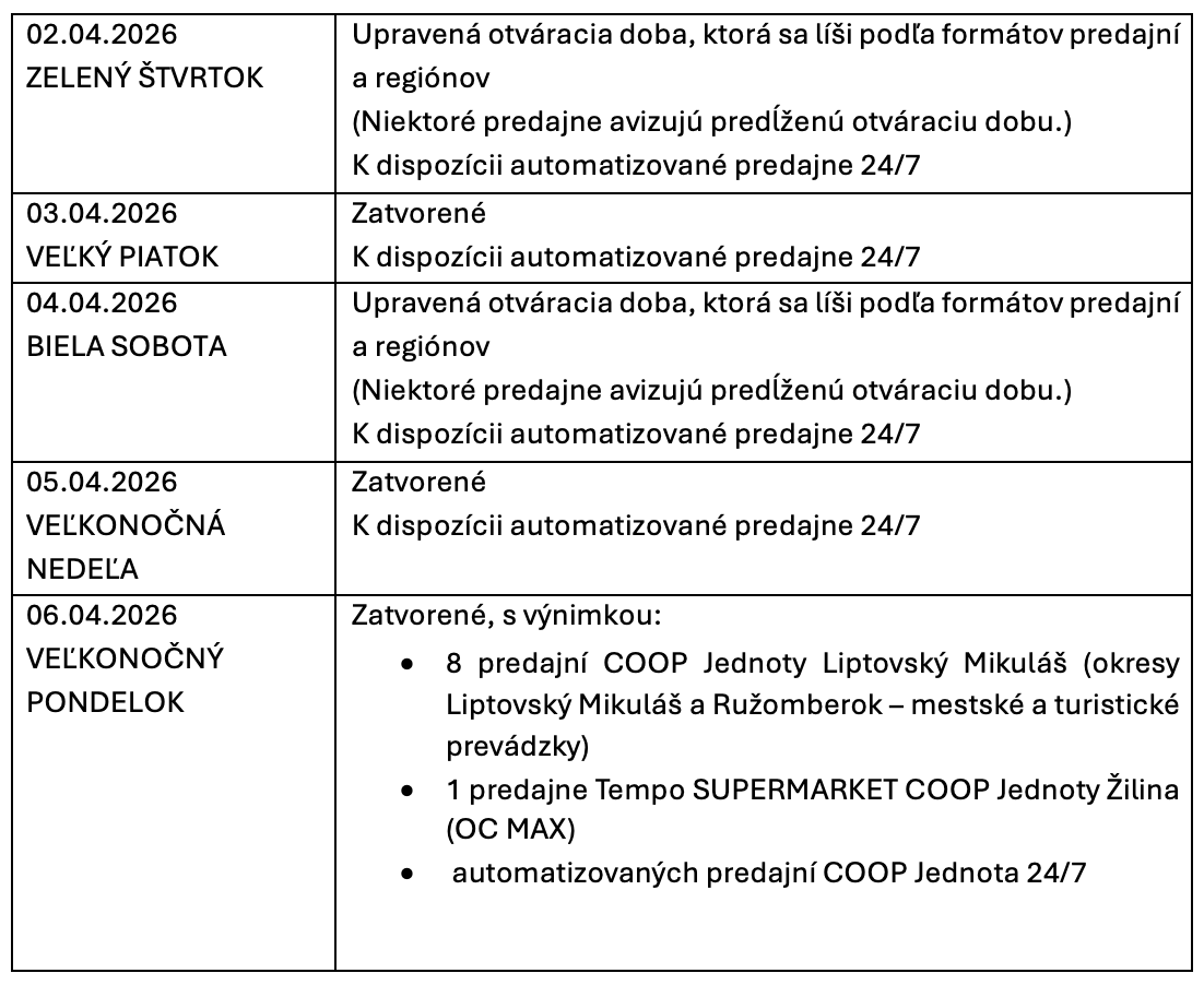 Otváracie hodiny štandardných predajní COOP Jednota sa počas veľkonočných sviatkov líšia podľa regiónu a formátu predajne. Jednotlivé spotrebné družstvá ich upravujú v súlade s platnou legislatívou. Zákazníkom preto najväčšia domáca sieť odporúča sledovať aktuálne informácie o otváracích hodinách priamo na predajniach alebo na webových stránkach jednotlivých družstiev.