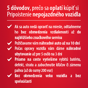 Menšie problémy, ako napríklad defekt, vybitie batérie či prázdnu nádrž, vyriešime hneď na mieste. Ak však auto ostane nepojazdné, má celá posádka (max. 5 ľudí) vďaka pripoisteniu zabezpečenú náhradnú dopravu domov, a to letecky, autobusom alebo vlakom až do sumy 1 500 €.
