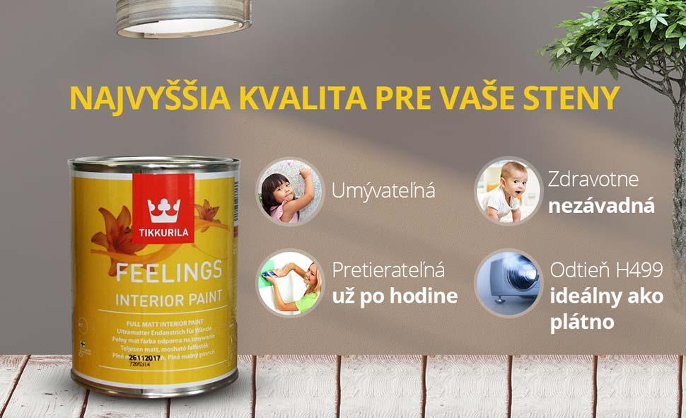 Súčasným trendom sú farebné steny a ich rôzne kombinácie. Okrem estetických dôvodov sú nezanedbateľné aj ich psychologické účinky. Správnym odtieňom docielite, že váš domov získa úplne nový rozmer a budete sa v ňom cítiť príjemne. Feelings interior paint je dostupný v niekoľkých tisíckach atraktívnych odtieňoch. Podľa vašich požiadaviek a potrieb vám ho v predajni natónujú v priebehu pár minút.