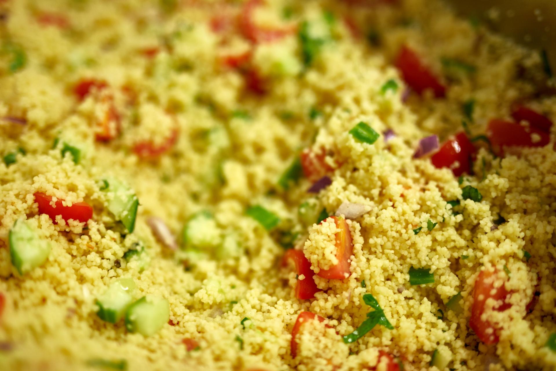 TABBOULEH: Kuskus zalejeme horúcim vývarom a zakryjeme. Necháme 10-15 minút napučať. Zeleninu nakrájame na drobné kúsky a spolu s nasekanou petržlenovou vňaťou a mätou zmiešame s kuskusom. Ochutíme soľou, korením, citrónovou šťavou a olivovým olejom.