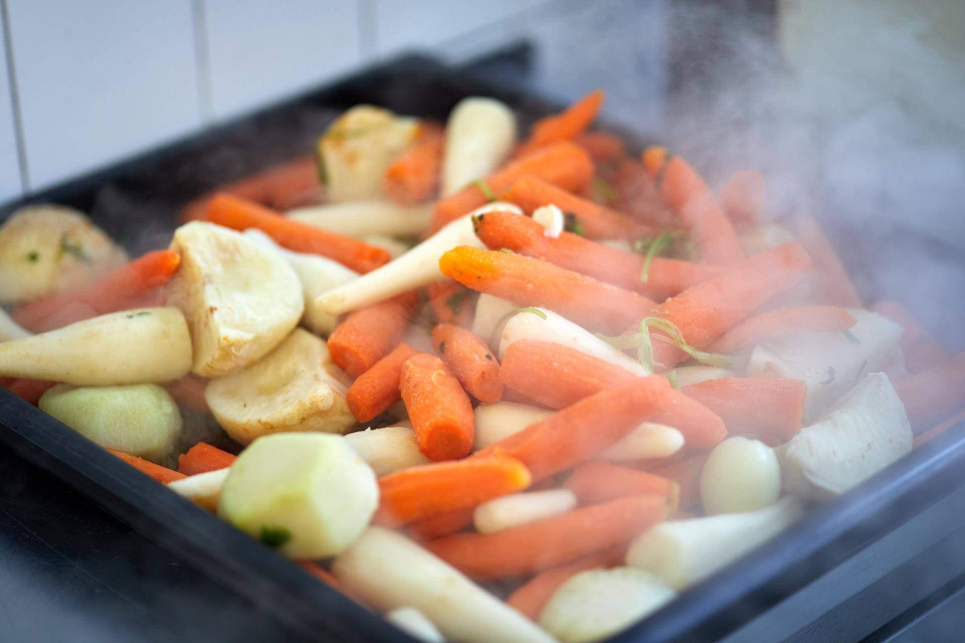 ZELENINA: Koreňovú zeleninu nakrájame na kúsky. Karfiol rozoberieme na menšie ružičky, fazuľku, ak je dlhá, prekrájame na menšie kúsky. Všetku zeleninu sparíme vo vode a potom zľahka prehrejeme s maslom. Všetko následne osolíme.