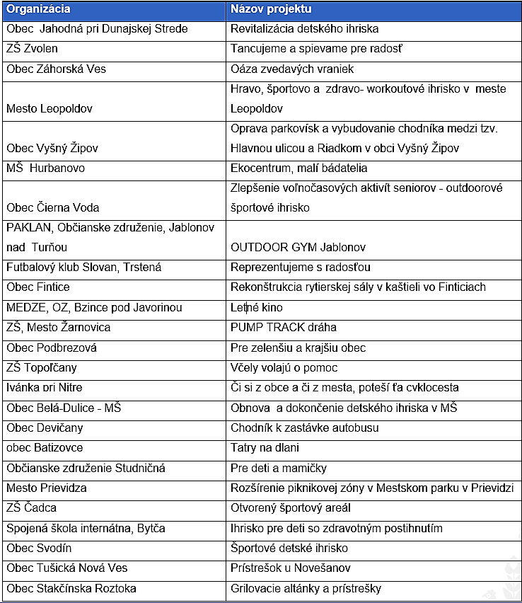 Cieľom projektu je podnecovať a podporovať rozvoj miestnych a regionálnych iniciatív a podpora účasti občanov na miestnom a regionálnom rozvoji formou drobných stavieb ako sú komunitné záhrady, altánky a prístrešky, ihriská, výsadbou zelene, budovaním turistických trás či propagáciou tradícií Slovenska a pod.