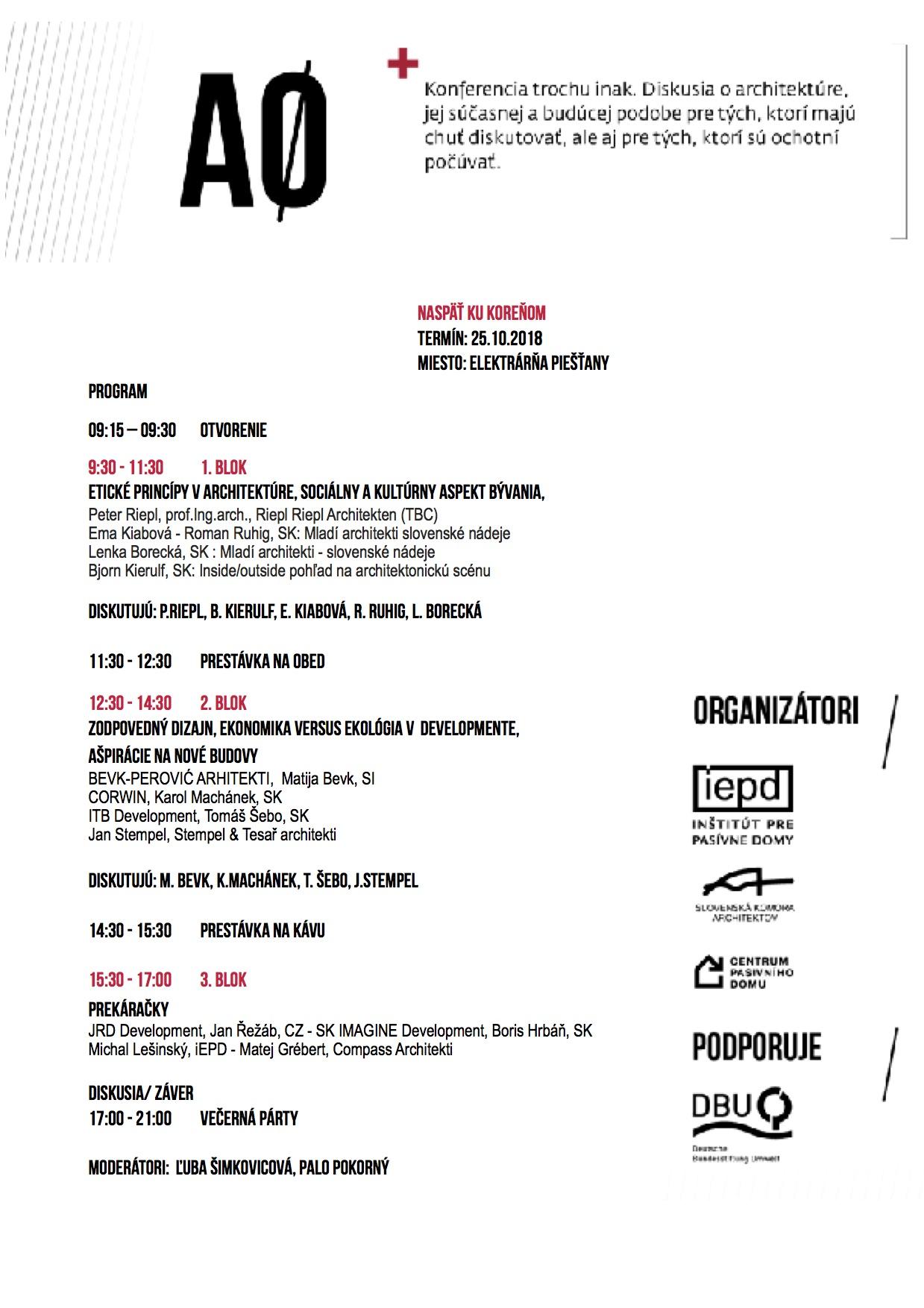 Konferencia sa bude konať dňa 25.10.2018 v priestoroch Elektrárne Piešťany. Organizátormi sú Inštitút pre pasívne domy spoločne so Slovenskou komorou architektov, a samozrejme v spolupráci s českým Centrom pasívního domu.