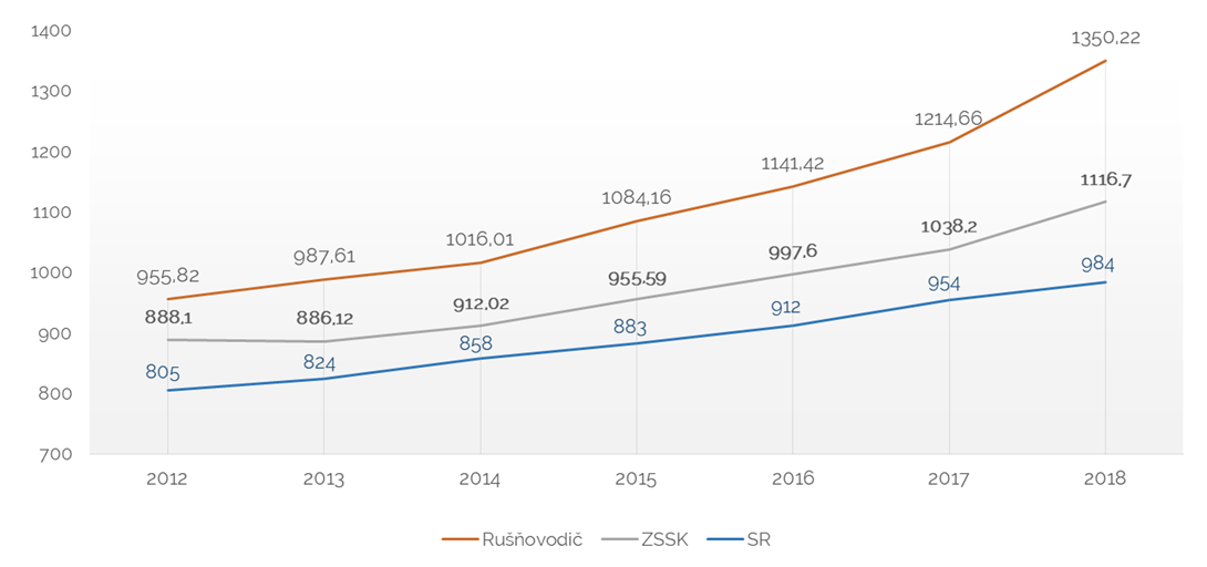 Vývoj priemernej mzdy zamestnancov ZSSK od roku 2012 približuje nasledujúci graf: