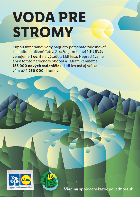 vďaka zákazníkom Lidla sa v Tatrách od roku 2012 podarilo vysadiť 1 250 000 stromčekov. Projekt „Voda pre stromy“ priniesol slovenskej prírode vo svojom deviatom ročníku ďalších približne 60 hektárov nového lesa. Celkovo sa Lidl les, ktorý rastie vo Vysokých i Nízkych Tatrách, rozprestiera na ploche väčšej ako 500 hektárov. Pre lepšiu predstavu, ide o rozlohu približne dvadsiatich piatich Štrbských plies.