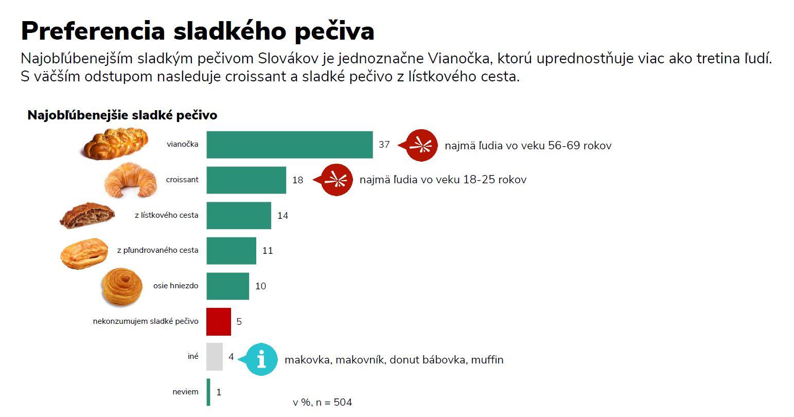 Najobľúbenejším sladkým pečivom sa v prieskume 2muse jednoznačne stala vianočka, ktorú v rámci sladkých druhov pečiva vyhľadáva viac ako jedna tretina opýtaných (37 %). Viac ako polovica oslovených ľudí vianočku konzumuje pre jej tradičnú chuť, ale zhruba u každého desiateho opýtaného vyvoláva spomienky na detstvo. Viac ako dve pätiny oslovených (42 %) pritom uviedli, že preferencie v pečive majú teraz iné ako za detských čias. „Opýtaní, ktorým sa postupom rokov zmenili chute, najčastejšie uviedli, že v súčasnosti konzumujú menej sladkého pečiva alebo jedia viac druhov pečiva. Takmer rovnako častou odpoveďou bola aj terajšia preferencia tmavších alebo zdravších druhov pečiva,“ povedala K. Kirchnerová.