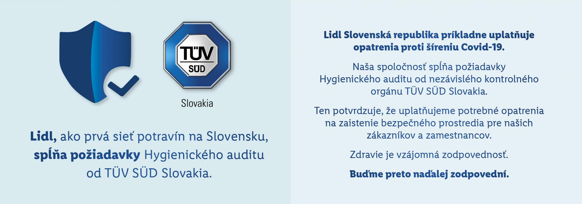 zodpovedné dodržiavanie preventívnych hygienických opatrení je pre boj so šírením nového koronavírusu kľúčové. Spoločnosť Lidl si to v plnej miere uvedomuje a preto má od prvého výskytu nákazy na Slovensku nastavené konkrétne opatrenia na ochranu zdravia. Audit nezávislého kontrolného orgánu TÜV SÜD Slovakia potvrdil, že Lidl uplatňuje potrebné opatrenia na zaistenie bezpečného prostredia pre svojich zákazníkov a zamestnancov. Diskont splnil požiadavky tohto Hygienického auditu ako prvá sieť potravín na Slovensku.