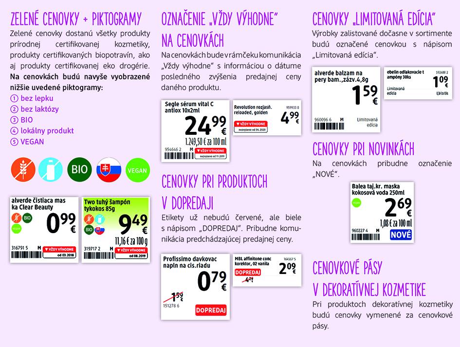 v rámci dlhodobej stratégie podpory udržateľných výrobkov – produktov certifikovanej prírodnej kozmetiky, drogérie a produktov biopotravín sa dm kvôli lepšej orientácii zákazníkov v sortimentnej ponuke rozhodla nasadiť nové cenovky. Pomocou pre zákazníkov sa tak od septembra tohto roka stali nové, zelené cenovky, pričom produkty prírodnej certifikovanej kozmetiky a produkty biopotravín majú navyše aj piktogram BIO. Spolu s týmito označeniami pribudli na regály dm aj cenovky označujúce produkty lokálnych slovenských výrobcov, ktoré sú označené slovenskou vlajkou. Orientáciu v sortimente potravín sa dm rozhodla uľahčiť aj zákazníkom s intoleranciami na laktózu a lepok alebo vegánom, a to označeniami príslušnými piktogramami.