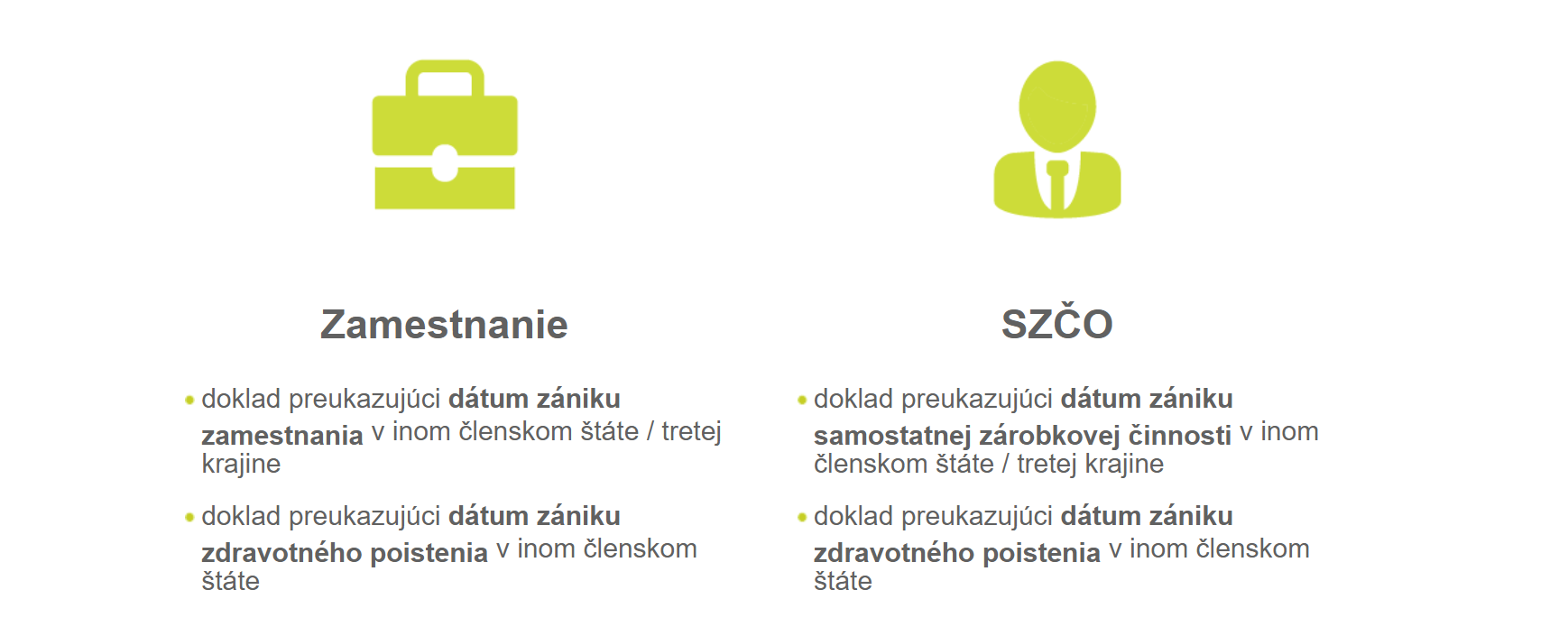 - SZČO - potvrdenie o ukončení SZČ, doklad o odvodoch do systému sociálneho zabezpečenia, formulár / prenosné dokumenty potvrdzujúce zdravotné poistenie v členskom štáte (E104, E108....), potvrdenie o zdravotnom poistení vydané zdravotnou poisťovňou