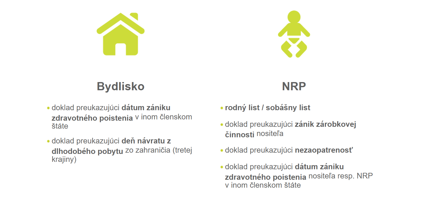 - Bydlisko v inom členskom štáte - doklad o odvodoch do systému sociálneho zabezpečenia, formulár / prenosné dokumenty potvrdzujúce zdravotné poistenie v členskom štáte (E104, E108....), potvrdenie o zdravotnom poistení vydané zdravotnou poisťovňou