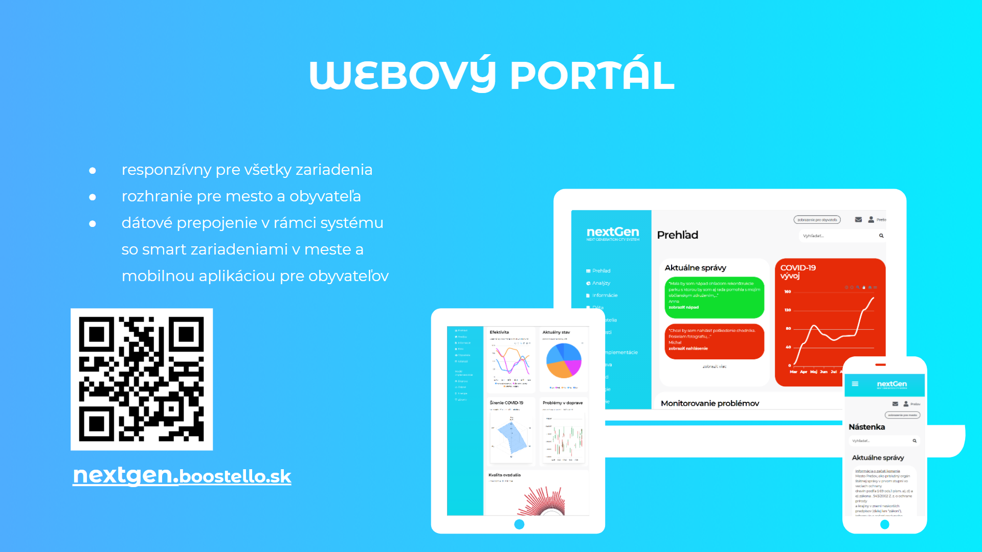 "Náš tím navrhol ako svoje riešenie systém s názvom nextGen. Súčasťou tohto systému je webový portál, mobilná aplikácia a implementačný model mesta. Týmto riešením sme sa zamerali na komplexnosť a digitalizáciu mesta, čím zvyšujeme efektivitu riadenia, zlepšujeme kvalitu života obyvateľov a to všetko so zreteľom na ekologické správanie (viac informácií nájdete aj v našej webovej appkehttps://nextgen.boostello.sk).” - Daniela Chovancová (tímlíderka)