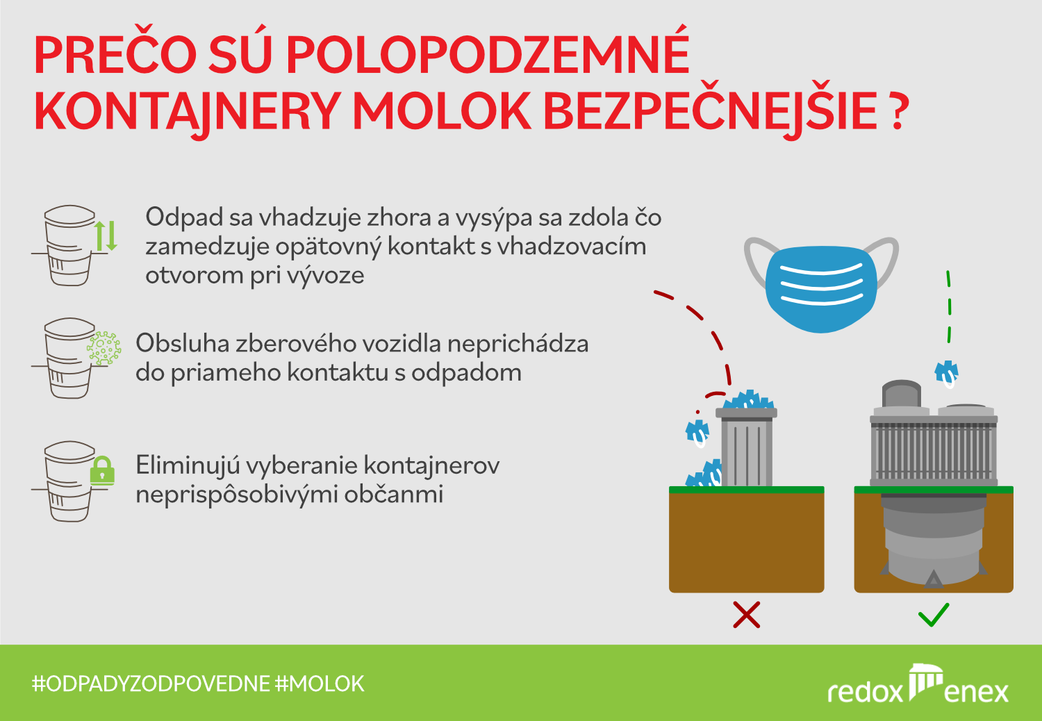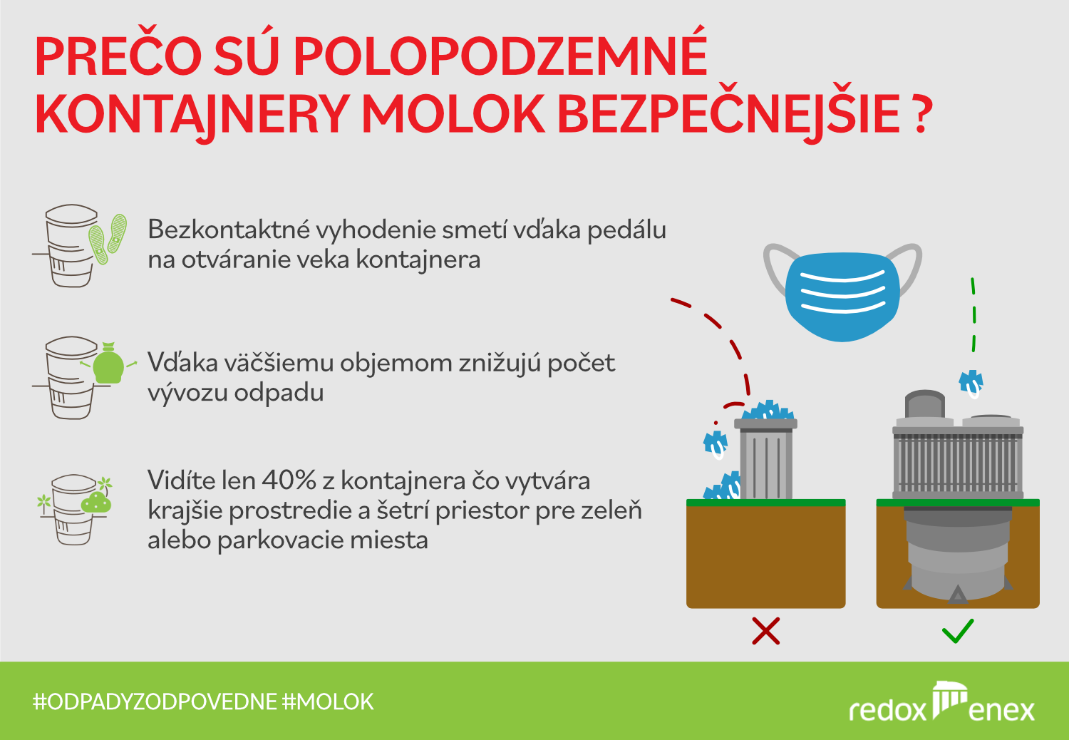 Mestá potrebujú uskladniť čo najviac komunálneho odpadu na malom priestore, so zachovaním vysokých nárokov na bezpečnosť, hygienu a zatraktívnenie vonkajších priestorov. Objem nenahradíte. Pravidlo, ktoré platí počas pandémie dvojnásobne. Bežné kontajnery na komunálny odpad počas pandémie svojou kapacitou nepostačujú a ľudia často ukladajú odpad mimo nich alebo je voľne položený na chodníku. V zmysle stanoviska ÚVZ SR sa použité ochranné prostriedky, ktoré vznikajú občanom v domácnosti alebo zamestnancom v bežných prevádzkach – rúška, respirátory, rukavice a vreckovky sa likvidujú ako bežný odpad. Nesprávne spracované a vyhodené odpady kontaminované vírusom SARS–COV2 (covid-19), môžu predstavovať riziko prenosu sekundárnej choroby. Denné množstvo takého materiálu použitého na celom svete je ohromujúce, ale iba odhadované, pretože nedošlo k hĺbkovej analýze a hodnoteniu množstva alebo rizík. „Počas mimoriadnej situácie, akou je pandémia ochorenia COVID-19, sa objem kontaminovaných odpadov zvyšuje, bezpečná manipulácia a účinné zneškodňovanie klesá, čo môže mať dopad na ľudské zdravie a životné prostredie. S týmto odpadom treba nakladať zodpovedne a zabezpečiť, aby nebol voľne vyhodený vedľa smetných nádob.“, upozorňuje Ing. Ján Hricko, konateľ REDOX – ENEX, výhradného dovozcu riešenia MOLOK na Slovensko.