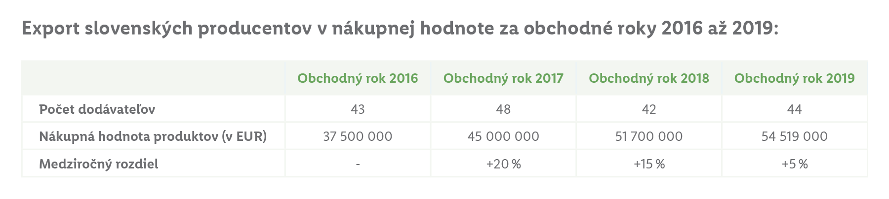 „Každým rokom nám rastie počet slovenských dodávateľov potravín, podiel ich výrobkov na našom sortimente a tiež ich celková hodnota. V poslednom uzavretom obchodnom roku sme slovenským dodávateľom zaplatili viac ako 320 miliónov eur v nákupných cenách – medziročne ide o nárast o 13 % alebo inak povedané o 40 miliónov eur. Aktívne podporujeme aj export slovenských firiem do zahraničia, ide o výrobky v hodnote desiatok,“ povedal Matúš Gála, generálny riaditeľ pre Lidl Slovensko.