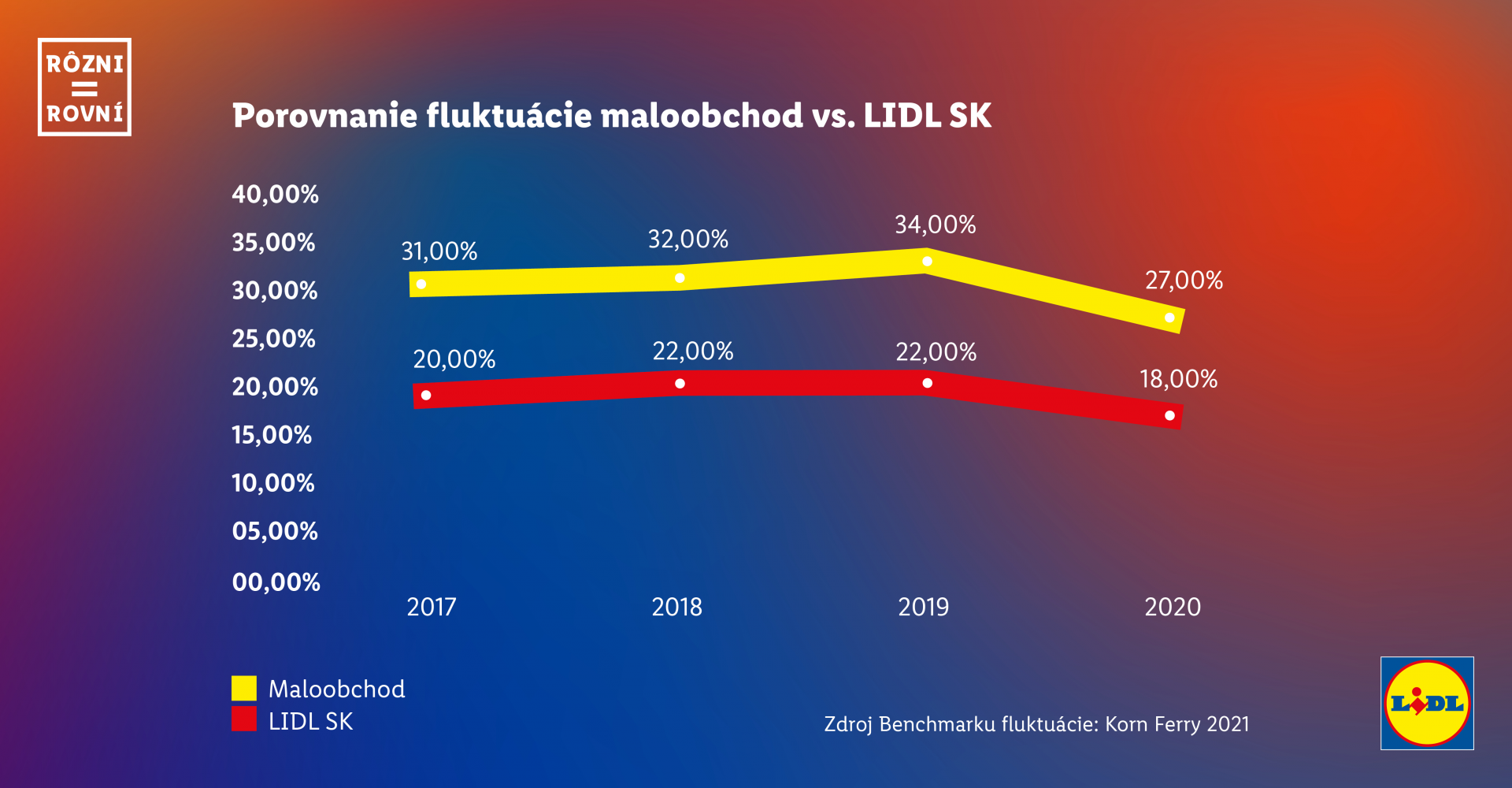„Kvalitné pracovné prostredie, rovnosť príležitostí, uvedenie diverzity a inklúzie do pracovných postupov majú pozitívny vplyv aj na nízku a zároveň stále klesajúcu fluktuáciu zamestnancov v spoločnosti. V roku 2020 bola hodnota fluktuácie iba 18%, zatiaľ čo priemer v retaile v tom istom období bol až 27%. Chceme byť prvou voľbou v oblasti zamestnávania a správnou voľbou pre našich zamestnancov“, vysvetľuje Michaela Průša Nešporová, riaditeľka ľudských zdrojov a členka predstavenstva Lidl Slovenská republika.