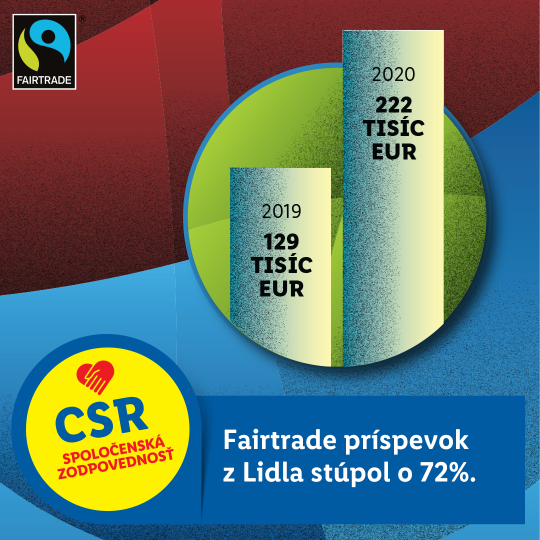 kvalita, zodpovednosť a férový obchod. Tieto hodnoty sú pre Lidl kľúčové a diskont nezostáva iba pri slovách. Vďaka predaju produktov s certifikáciou Fairtrade v Lidli získali pestovatelia z rozvojových krajín za rok 2020 príspevok vo výške 222 000 €. Ide o približne polovicu z celkového fairtradového príspevku zo Slovenska za predošlý rok. V roku 2019 putoval pestovateľom z Afriky, Ázie a Latinskej Ameriky vďaka predaju výrobkov v Lidli príspevok 129 000 € a už vtedy bol diskont najväčším prispievateľom zo Slovenska. Medziročný nárast predstavuje viac ako 70%, v rozpätí troch rokov sa príspevok Lidla dokonca viac ako strojnásobil.