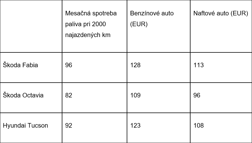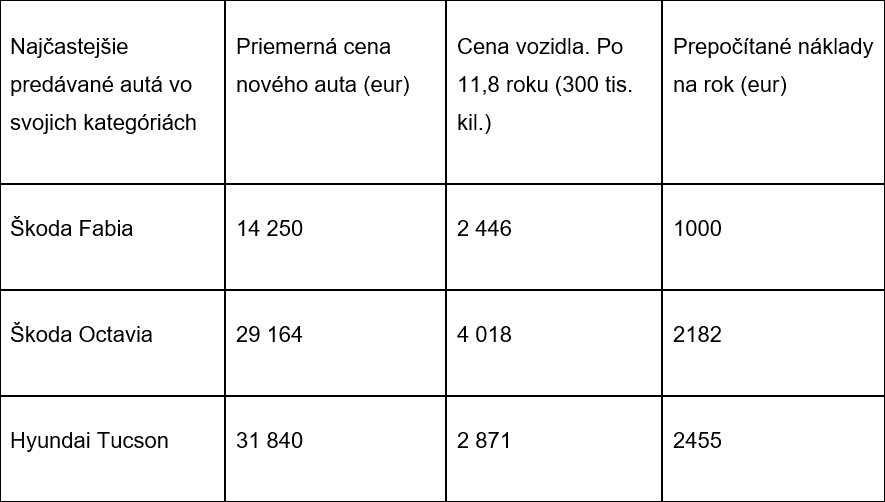 Náklady na palivo, samozrejme, tvoria významnú časť nákladov. Podľa štatistík, priemerne najazdí mesačne auto na Slovensku 2 000 km za mesiac. Ak vychádzame z tohto predpokladu, tak za životnosť auta 11,8 roka má auto najazdených okolo 300 000 km.