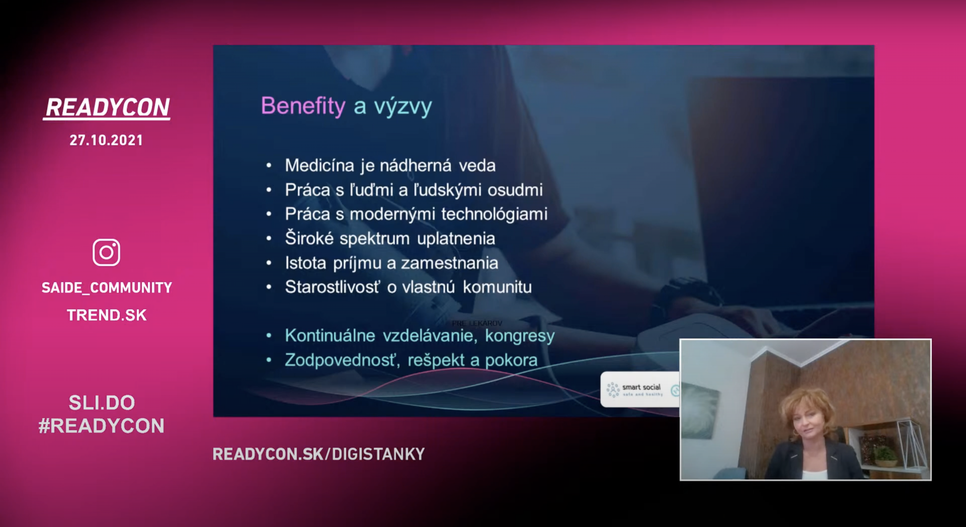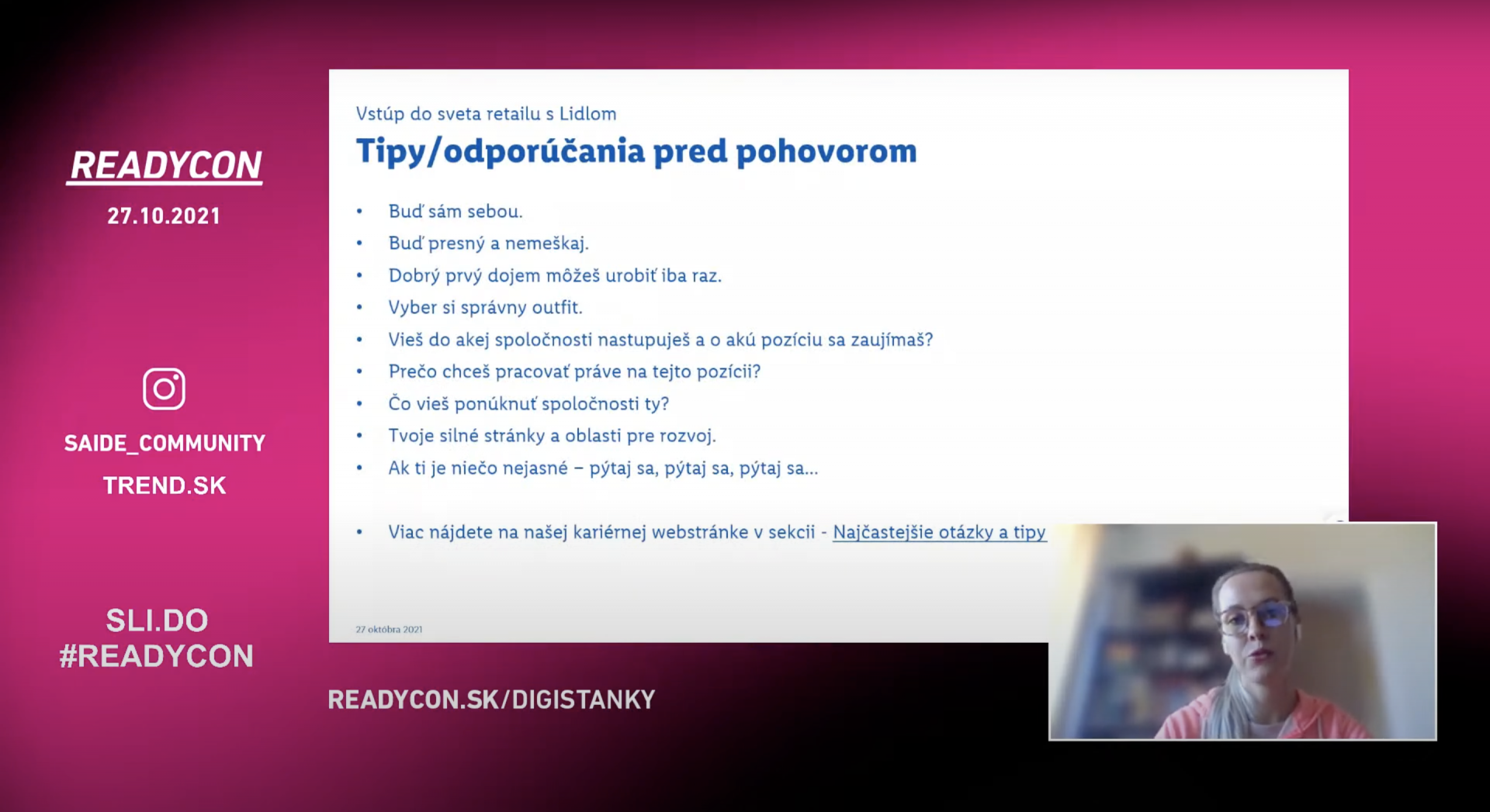 v mene prípravy študentov na budúci trh práce a budovania povedomia o tejto problematike sa 27. októbra konala konferencia READYCON – najväčšia online udalosť o budúcnosti práce pre maturantov. Konferencia bola organizovaná Slovenskou asociáciou pre rozvoj inovácií vo vzdelávaní (SAIDE) a podieľali sa na nej desiatky odborníkov, ktorí sa pripájali nielen zo Slovenska, ale aj z Mníchova, New Yorku či San Francisca. Toto celé by však nemalo zmysel, ak by sa do procesu nezapojili stovky pedagógov, ktorí pomáhali s premietaním a koordináciou študentov priamo v triedach naprieč celým Slovenskom. Konferencie sa totiž zúčastnili stovky tried z viac ako 240 partnerských stredných škôl, ktoré si môžete pozrieť na webstránke readycon.sk/partnerske-skoly. Všetkým patrí obrovské „Ďakujeme!“.