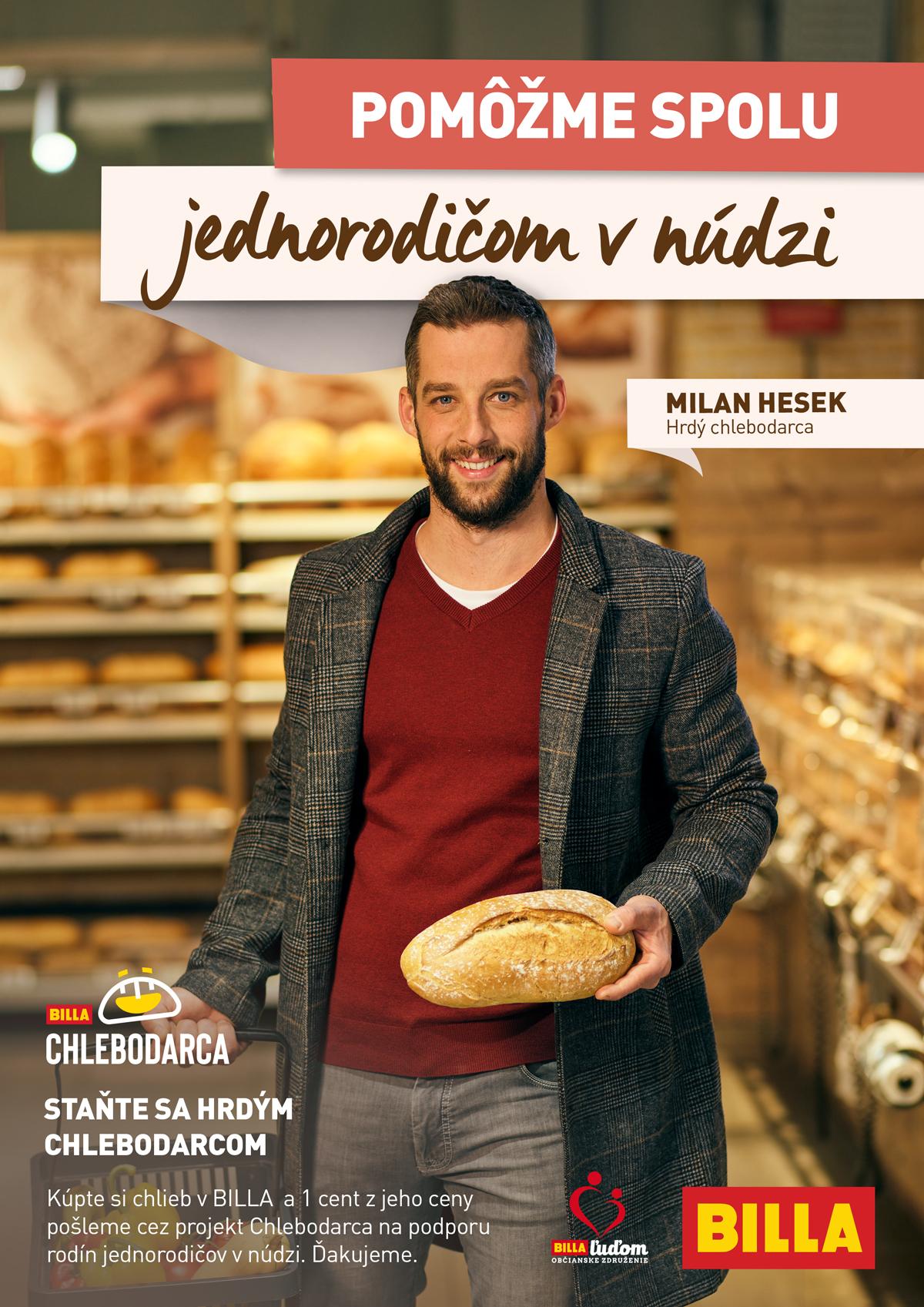 každý zákazník môže podporiť jednorodičov v núdzi a stať sa hrdým chlebodarcom – stačí si len kúpiť chlieb v predajniach BILLA. Taká je hlavná myšlienka novej mediálnej kampane Aj ty môžeš byť hrdinom! spoločnosti BILLA, ktorá zviditeľňuje projekt CHLEBODARCA. Ústrednou postavou kampane je Milan Hesek, spokojný zákazník BILLA. „Nie som zdravotník ani požiarnik. Ale som vždy veľmi rád, keď môžem pomôcť. Nielen deťom, ale aj rodičom, ktorí ostali na svoje deti sami,“ hovorí M. Hesek v novom televíznom spote. V ňom zalepí chlapčekovi rozbité koleno, deťom hrajúcim sa futbal hodí odkotúľanú loptu, mamičke s kočíkom pomôže nastúpiť do autobusu, až si nakoniec do nákupného vozíka v BILLA vloží chlieb a vyzve divákov, aby aj oni pomohli jednorodičom v núdzi.