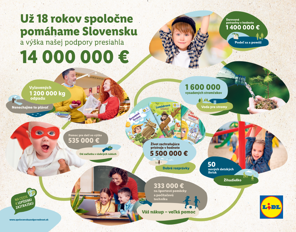 Lidl už osemnásť rokov robí Slovensko lepším miestom pre život. Za toto obdobie zorganizoval a podporil projekty v hodnote viac ako 14 miliónov eur. Pomohol stovkám vážne chorých detí, vysadil 1 600 000 stromčekov v Tatrách, venoval stovky život zachraňujúcich prístrojov novorodeneckým oddeleniam, postavil päťdesiat ihrísk Žihadielok, vylovil viac ako 1 200 ton plastov zo slovenských riek a vodných nádrží, zorganizoval najväčšiu a stále prebiehajúcu potravinovú zbierku v krajine, podporil vzdelávanie desiatok tisícov žiakov na základných školách naprieč celým Slovenskom a mnoho ďalšieho. Lidl si celkovo stanovuje ambiciózne ciele, ktoré sa mu však darí napĺňať. Vďaka technologickým inováciám, postupom a zelenému energetickému mixu šetrí desiatky tisíc ton emisii CO2 ročne. Spolu s kompenzačnými projektami vďaka tomu dosiahne na Slovensku v roku 2022 uhlíkovú neutralitu v rámci svojej prevádzkovej činnosti. Ďalší dosiahnutý míľnik sa týka plastovej stratégie reťazca, keďže Lidl dokázal na Slovensku ušetriť v porovnaní s rokom 2017 viac ako 20 percent plastov a svoj ciel splnil s trojročným predstihom oproti plánu.