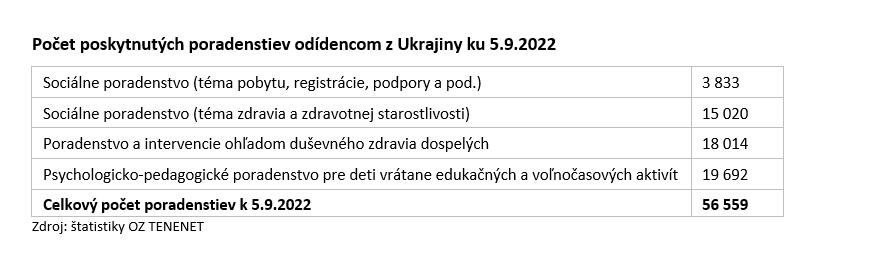 V rámci pomoci utečencom v Bratislavskom kraji odborníci OZ TENENET doteraz poskytli vyše 56.000 poradenstiev a intervencií. Podľa údajov rezortu vnútra SR k 31.8.2022 o dočasné útočisko v danom kraji požiadalo 29 036 osôb, čo znamená, že sa v priemere pomohlo dva krát každému z nich. Z celkového počtu sa 18 014 poradenstiev týkalo psychickej podpory a duševného zdravia dospelých a 19 692 krát sa jednalo o psychologicko-pedagogické poradenstvo pre deti. „Naše štatistiky jasne ukazujú, že záujem o pomoc zo strany odídencov z Ukrajiny od začiatku vojny neustále stúpa. Zmenil sa však druh pomoci. Na začiatku sme sa viac zaoberali krízovým poradenstvom a poradenstvom v oblasti základných humanitárnych potrieb ako sú rady ohľadom pobytu, ubytovania, zdravotníckych problémov. V lete sa do popredia výrazne dostali otázky psychického zdravia a taktiež pracovné poradenstvo,“ uvádza Zuzana Aly, koordinátorka psychosociálnej podpory OZ TENENET.