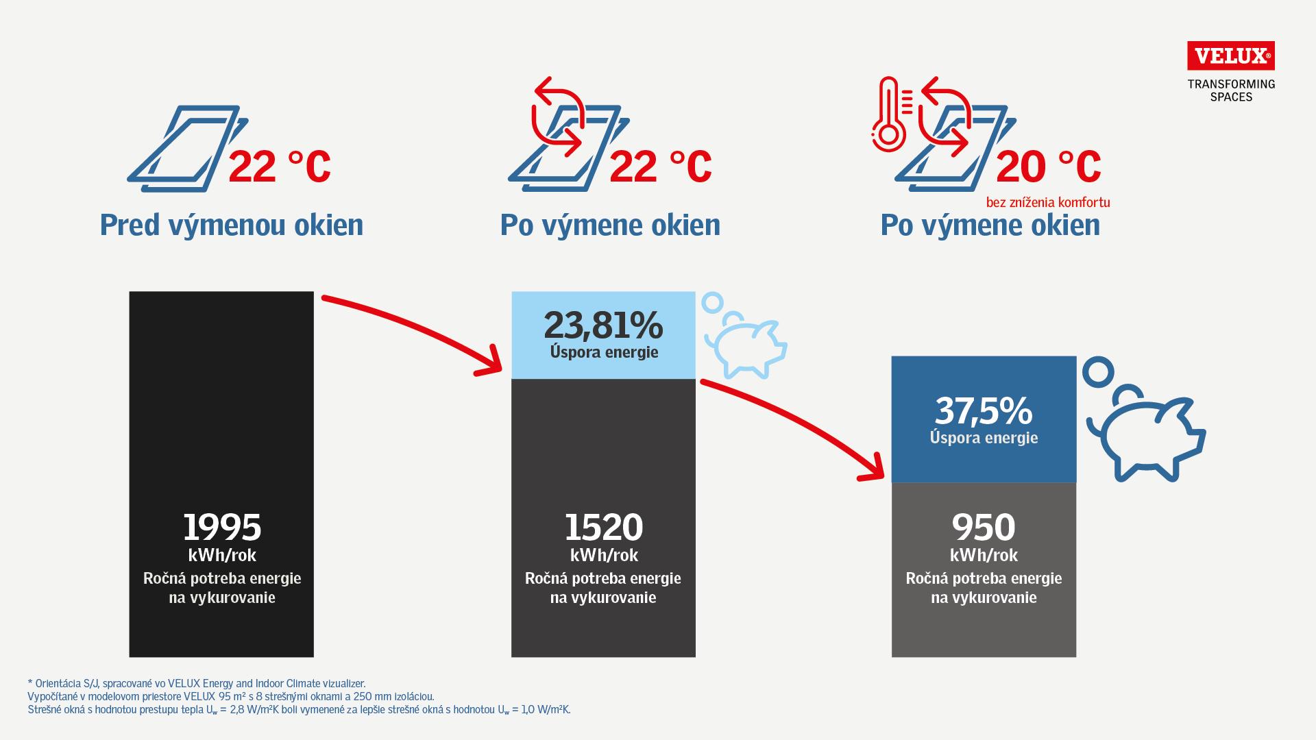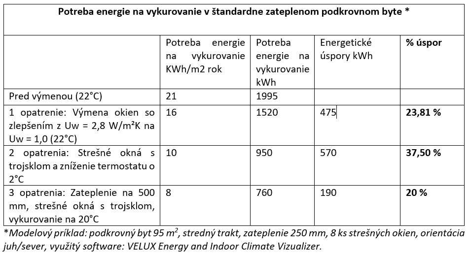 Moderné strešné okno ihneď po jeho výmene zlepšuje hospodárenie s energiami. Nie vždy je priestor a čas na komplexnú renováciu. Výmena strešných okien je oproti tomu rýchlo realizovateľné opatrenie bez väčšieho neporiadku a umožňuje znížiť teplotu na termostate bez straty pohodlia. Nové strešné okná v kombinácii s ďalšími dvoma úspornými opatreniami môžu pomôcť znížiť potrebu energie na vykurovanie o desiatky percent. Prehľad opatrení a ich dosah na úsporu v modelovom podkroví tu: