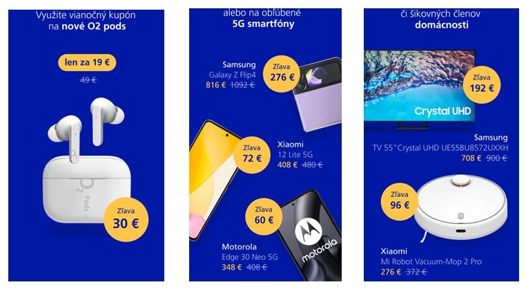 Zľavu v príslušnej hodnote si môže uplatniť na slúchadlá O2 pods, smartfóny Samsung Galaxy Z Flip4, Xiaomi 12 Lite 5G, Motorola Edge 30 Neo 5G, vysávač XIAOMI Mi Robot Vacuum Mop 2 Pro alebo televízor Samsung TV 55" Crystal UHD.