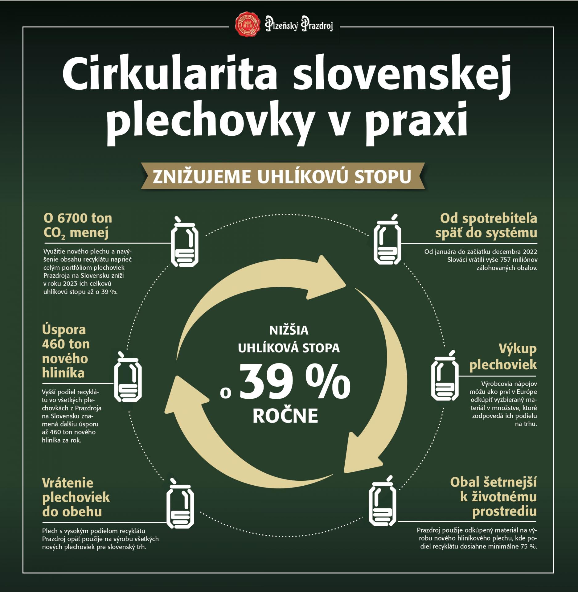 V rámci smerovania k cirkularite obalov Prazdroj od roku 2023 inovuje všetky svoje plechovky na Slovensku, pri ktorých v ich tele navýši podiel recyklovaného hliníka z priemerných 47 % až na 75 %. „Všetky naše plechovky pre slovenský trh budú po novom z troch štvrtín vyrobené z recyklátu. Umožňuje nám to materiál získaný zo slovenských plechoviek vyzbieraných zálohovým systémom. V praxi to znamená, že z odovzdanej plechovky sa opäť stane plechovka. Na Slovensku sme takto ďalší rok schopní ušetriť ďalších 460 ton nového hliníka,“ ozrejmuje Martina Vajskebrová, manažérka výrobných materiálov a obalov Plzeňského Prazdroja.