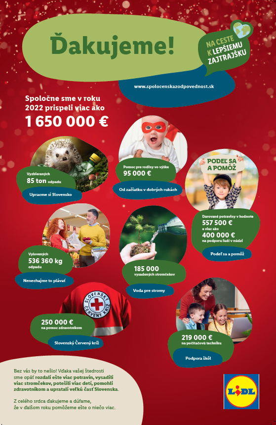 Ktorá pomoc sa ráta? Odpoveď je opäť naporúdzi: každá! Vďaka zázračným ľuďom, ktorí nakupujú a pracujú v Lidli a zapájajú sa do jeho projektov, sa opäť podarilo spraviť v roku 2022 zo Slovenska lepšie miesto pre život. „Bez našich zákazníkov a zamestnancov by to nešlo. Vďaka ich podpore a štedrosti sme opäť rozdali viac potravín, vysadili viac stromčekov, potešili a pomohli viacerým deťom, podali pomocnú ruku zdravotníkom a upratali o čosi väčšiu časť našej krajiny. Z celého srdca ďakujeme všetkým, ktorí sa o to zaslúžili, a dúfame, že v ďalšom roku spoločne pomôžeme zase o niečo viac,“ povedala Zuzana Sobotová, senior konzultantka pre CSR projekty.