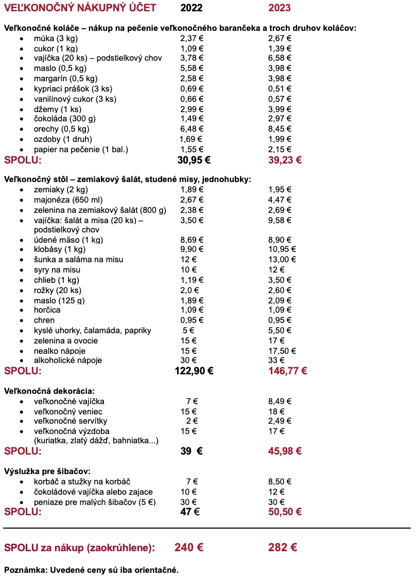 Oproti minulému roku sa treba pripraviť na to, že pri nákupe na sviatky jari bude potrebné siahnuť hlbšie do vrecka. Asi najväčším výdavkom domácnosti budú potraviny. „Výdavky na veľkonočný stôl sa môžu hýbať okolo 150 eur, pričom najdrahšou položkou sú mäsové výrobky (šunka, saláma, údené mäso) a vajíčka,“ upozorňuje Linda Valentín. Podľa nášho nákupného zoznamu je najväčšie zdraženie pri vajíčkach a chlebe, ktorých cena sa takmer strojnásobila. Citeľný nárast cien zaznamenávame aj pri nápojoch, najmä alkoholických. Naopak, ceny sa takmer nezmenili pri základných ingredienciách na pečenie, ako sú múka, cukor, vanilínový cukor. Dokonca pri masle a kypriacom prášku sme si všimli zníženie cien. Celkovo nás veľkonočný nákup môže vyjsť aj na 280 eur vrátane dekorácií a výslužky pre šibačov. Počítať treba aj s výdavkami na cestovanie za rodinou.
